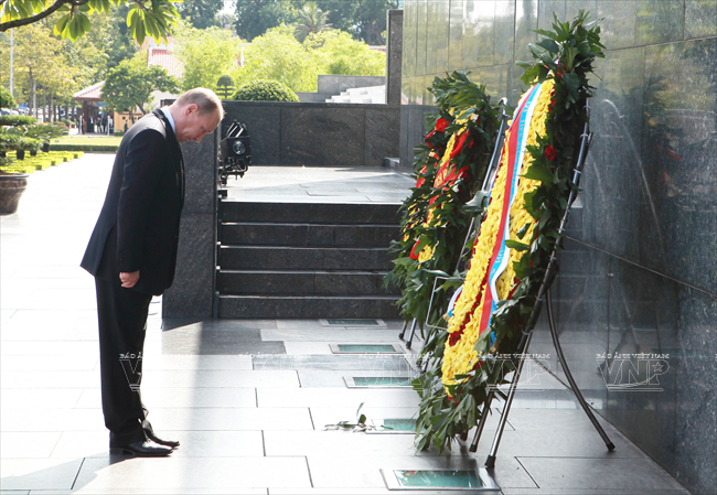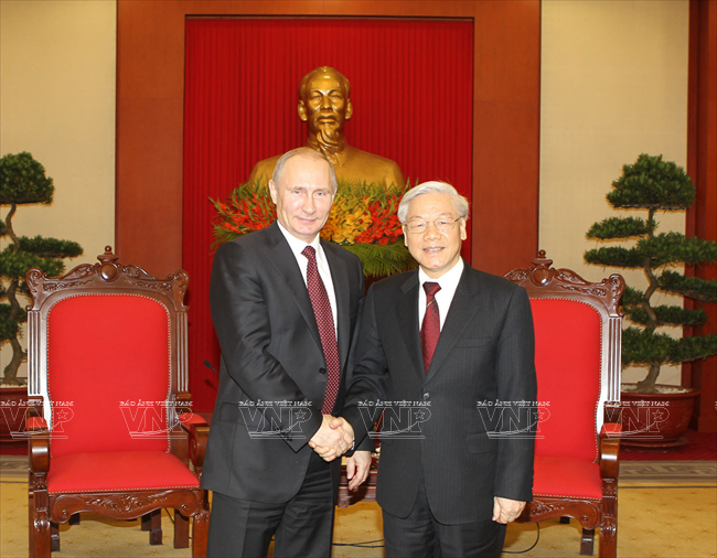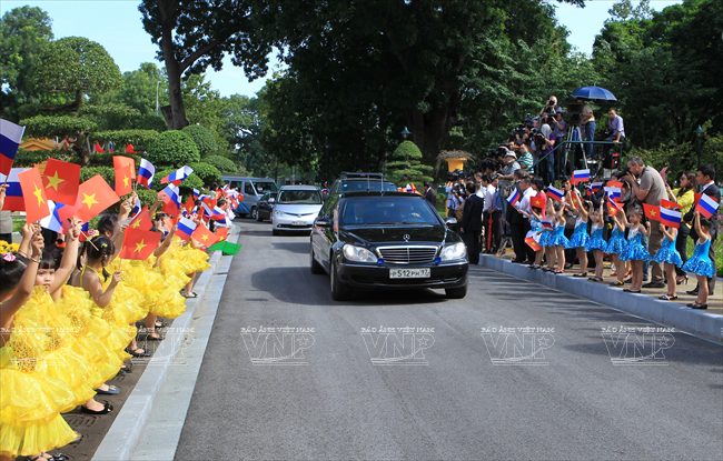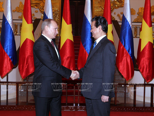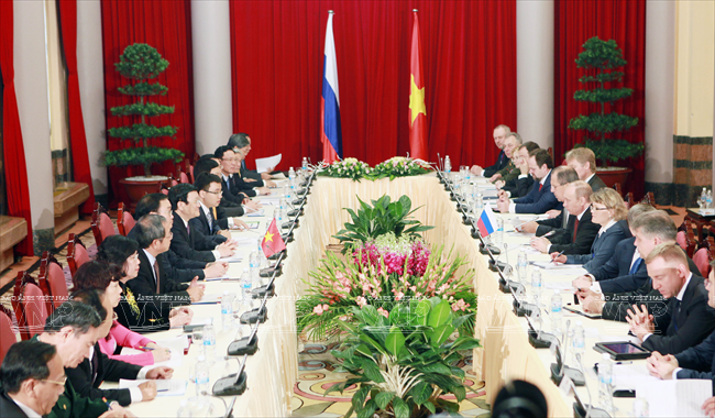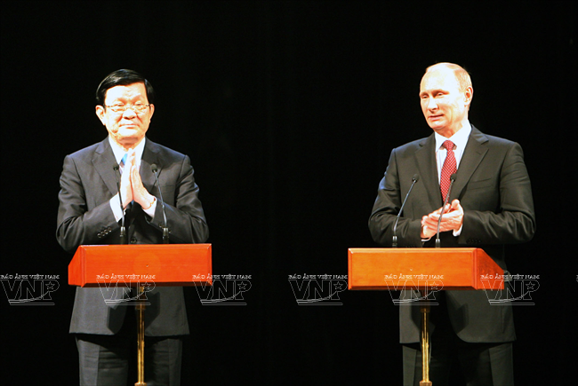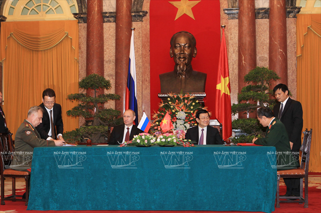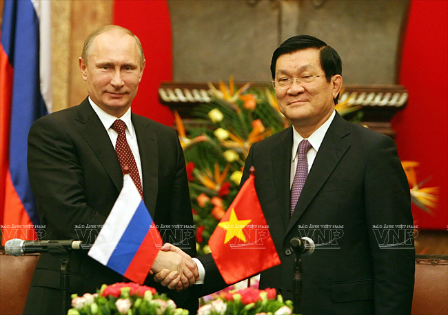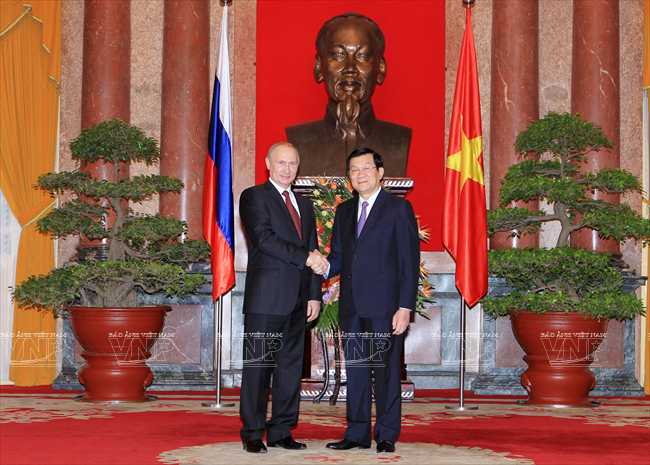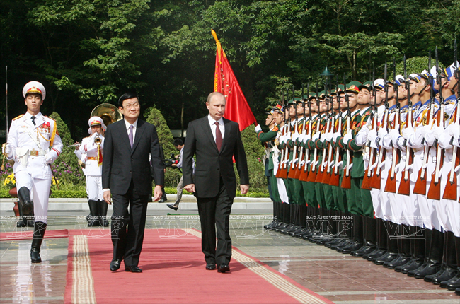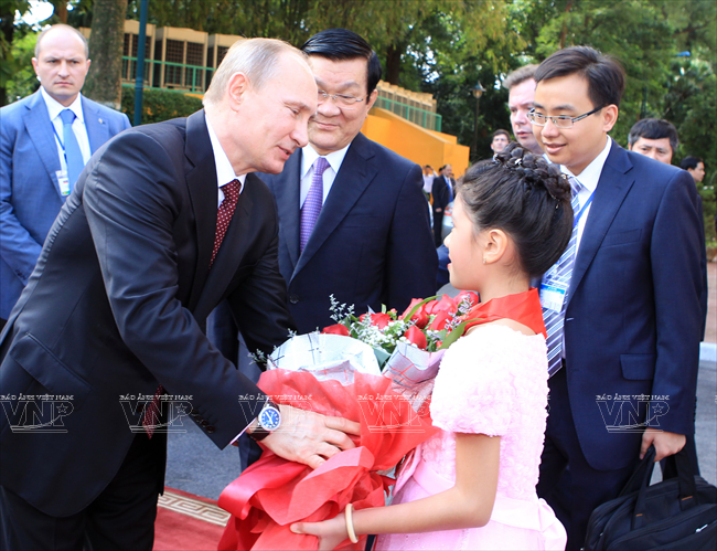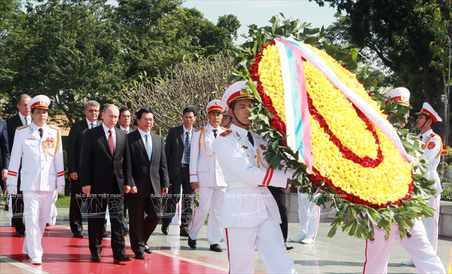 俄罗斯总统弗拉基米尔•弗拉基米罗维奇•普京于2013年11月12日对越南进行国事访问仅只一天,但受到舆论特别注意。因为这不仅是普京总统的第三次访越,而且对加强越俄两国全面战略伙伴关系具有特别重大意义。这最明显地表现在两国签署了各领域的17 个重要合作文件。 访越前夕,俄罗斯联邦总统普京撰文歌颂越俄传统友好情谊。文章有一段写道:“俄越友谊已坚强地越过了20世纪许多悲痛事件以及世界和我们两国重大变迁的种种挑战。但永恒不变的一点是相互尊重、相互信赖、相互帮助的传统关系,懂得珍惜永不背叛的伙伴的慷慨无私援助。” 因此,在访越期间,同国家主席张晋创会谈,分别同越共总书记阮富仲、政府总理阮晋勇会见时,双方领导高度评价将越俄战略伙伴关系提升为全面战略伙伴关系,开创务实的新机会促进两国多领域的互利合作。双方表示满意两国通过传统方式和创新方式的合作日益扩展,日益全面。 河内首都民众热烈欢迎俄罗斯总统普京重访。越通社记者 阮康 摄 河内首都儿童向俄罗斯总统普京敬献鲜花。越通社记者 阮康 摄 俄罗斯总统普京欢迎仪式以最高规格在主席府隆重举行。越通社记者 阮康 摄 张晋创主席在主席府迎接俄罗斯总统普京。越通社记者 阮康 摄 张晋创主席同普京总统会谈。越通社记者 阮康 摄 张晋创主席与普京总统出席越俄国防合作协定签字仪式。越通社记者 阮康 摄 张晋创主席与普京总统出席记者会。越通社记者 阮康 摄 越共总书记阮富仲接见俄罗斯总统普京。越通社记者 智勇 摄 阮晋勇总统会见普京总统。越通社记者 德旦 摄 « “ ‘饮水思源’是胡志明主席曾提到的越南人共同的道义。我将此视为对我们两国今天与未来各代公民的精神委托。 我们务必铭记将我们联系在一起的共同历史篇章。这是面向未来的关系继承性和持久性的保障。” » (俄罗斯总统普京) 张晋创主席与普京总统一致同意力争双边贸易额2015年达70亿美元,2020年达100亿美元,与两国合作潜力相应。 关于若干具体问题,两国领导一致同意应该采取突破性的措施促进两国贸易、投资关系,其中优先尽早签署越南与 俄罗斯、哈萨克斯坦、白俄罗斯关税联盟的自由貿易协定;优先发展以油气与核电为核心的能源合作,为两国公司和合资企业推进现有项目及新项目创造便利条件;以使用现代化工艺、保证绝对安全,达到最高效果和最高质量为方针加快建设宁顺一号核电站,并在培训核专家方面继续密切合作。 双方肯定在矿产开采、交通(包括民用航空)、造船、机器制造、通信联络等领域继续合作;研究在俄罗斯联邦远东地区建设轻工业区的投资合作可能性。双方高度评价国防、军事技术领域合作的 高可靠性,符合国际法规已和准则,致力于保证亚洲太平洋地区的和平、稳定、持久性发展。 关于国际合作,双方强调在亚洲-太平洋地区、亚太经济合作论坛和以东盟为支柱的东盟地区论坛(ARF)、东亚峰会(EAS)、亚欧合作论坛(ASEM)、东盟国防部长扩大会议(ADMM+)等的越俄合作关系的重要性,同意加强俄罗斯-东盟合作,为促进地区和世界的和平、合作、发展作出贡献。 普京总统在英雄烈士纪念碑敬献花圈。越通社记者 仲德 摄 普京总统向胡志明主席陵敬献花圈。越通社记者 仲德 摄 张晋创主席与普京总统出席在越南的俄罗斯文化日开幕式并发表讲话。越通社记者 阮康 摄 普京总统与张晋创主席会晤在主席招待宴会演出助兴的越南艺术家。越通社记者 仲德 摄 张晋创主席和普京总统参观“越通社与俄塔社记者镜头里的越俄关系”图片展。图为越通社社长阮德利向张晋创主席和普京总统介绍参展图片。越通社记者 阮康 摄 这些访越成果显示越俄高级领导人促进越俄全面战略伙伴关系,提高双方合作质量,推动各自国家的发展和现代化事业的意志和决心,是一座至关重要的里程碑,为推进越俄关系迈上新台阶注入新动力。 17项越俄合作文件: 1/越南社会主义共和国和俄罗斯联邦关于移交被判刑人员协定。 2/越南社会主义共和国政府和俄罗斯联邦政府关于国防合作协定。 3/越南社会主义共和国和俄罗斯联邦政府关于越南公民在俄罗斯接受培训协定。 4/越南科学工艺部和俄罗斯联邦教育与科学部关于科技和创新备忘录。 5/越南资源与环境部和俄罗斯资源与生态部关于地质与矿产资源利用合作备忘录。 越南卫生部与俄罗斯卫生部在2014年-2016年阶段保健和医学领域合作计划。 越南卫生部与俄罗斯保护消费者权利监督机关关于保证卫生防疫安全领域合作备忘录。 8/越南质量认证中心与俄罗斯质量认证中心合作备忘录。 9/胡志明主席陵管理处与橡胶工业研究院公司关于研究和转让生物医学工程用橡胶制品生产工艺合同。 10/ 越南石油集团与俄罗斯Rosneft石油公司关于在越南陆架探采?15-1/05石油区备忘录。 11/越南石油集团与Rosneft石油公司关于在伯朝拉(Pechora)海域石油探索、勘测和开采工作的基本条件协议。 12/越南石油集团与俄罗斯Gazprom公司关于成立气体燃料发动机联营公司协议。 13/越南石油集团与俄罗斯Zarubezneft公司关于发展、提高Rusvietpetro联营公司运营效果备忘录。 14/越南石油集团与俄罗斯Gazprom Neft公司关于炼油框架协议。 15/越南投资发展银行和俄罗斯联邦国际投资银行信贷协议。 16/越俄银行和Uralvagonzavod公司