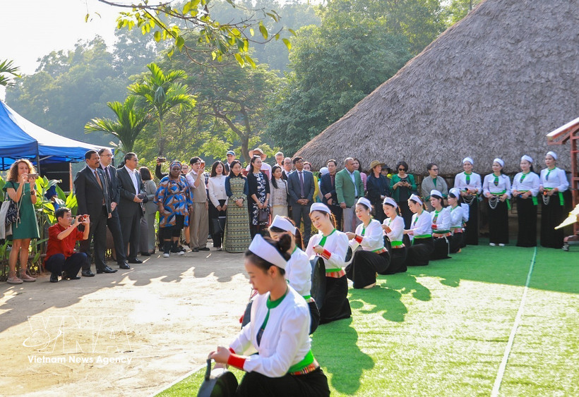 越南各民族文化旅游村的芒族同胞向游客推介本民族文化特色。图自越通社
