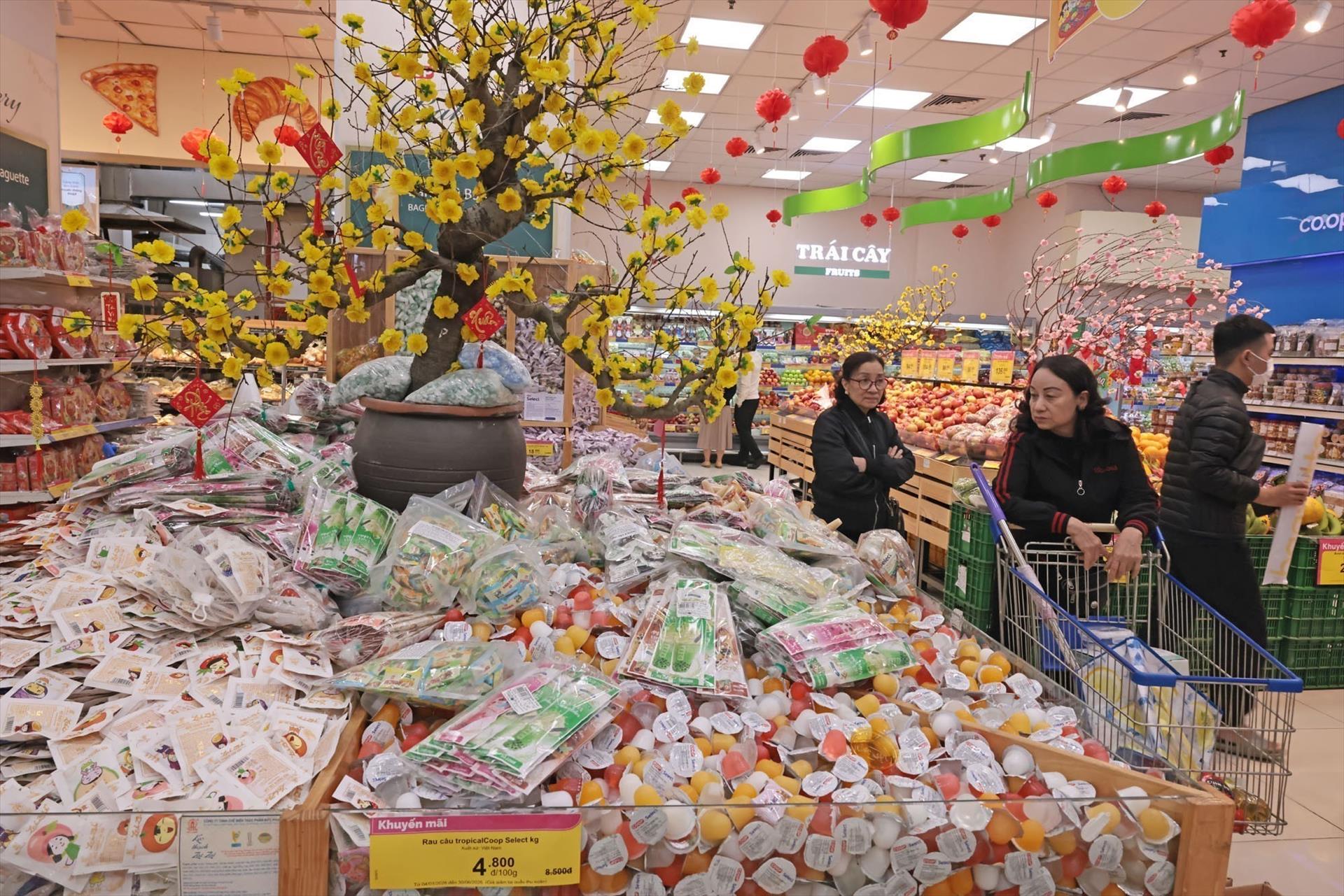 在金瓯省,从腊月初开始,服务于春节的各样商品已广泛上架销售。在许多地方,越南货获优先陈列于便利位置,品种丰富,涵盖食品、糖果糕饼、家居用品、农产品、时装。在Co.opmart、WinMart、绿色百货、GO!等现代零售系统,购买力随春节临近逐日攀升。据多地记录,越南货占上架商品数量高达90-95%。