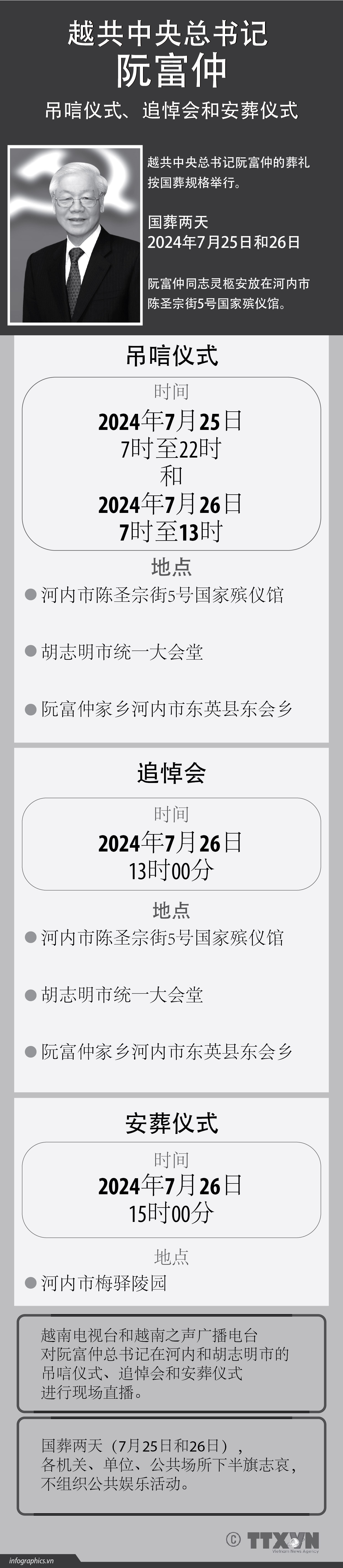 新闻 越共中央总书记阮富仲吊唁仪式、追悼会和安葬仪式 25/07/2024 越共中央总书记阮富仲的葬礼按国葬规格举行。阮富仲同志的吊唁仪式、追悼会同一时间在胡志明市统一大会堂和阮富仲家乡河内市东英县东会乡举行。