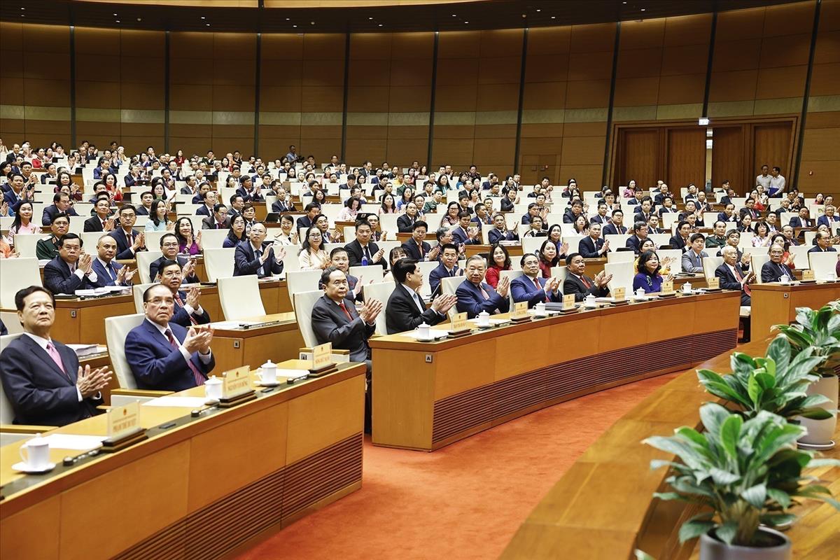 Party General Secretary To Lam and leaders of the Party, State and the Vietnam Fatherland Front, together with NA deputies, attend the opening ceremony of the 16th NA's first session. Photo: VNA