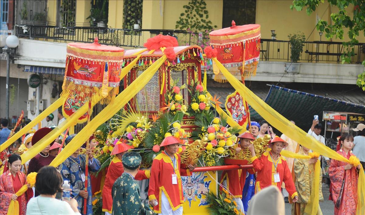 The procession respectfully escorts the Holy Mother and the Four Palaces Council by land. Photo: VNA