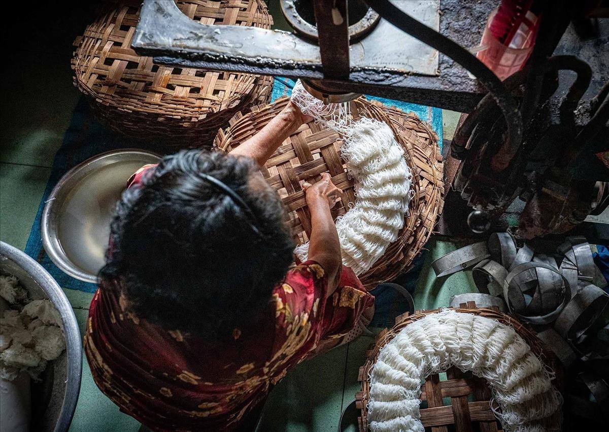 As the dough is pressed through the extruder, it emerges in fine strands. The artisan swiftly catches and separates them by hand into small, even portions, neatly arranged on bamboo trays. Photo: VNA