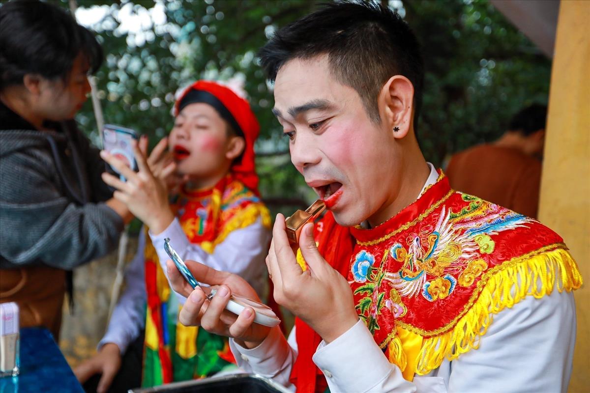 Men put on makeup before performing "Con Di Danh Bong" dance. Photo: VNA