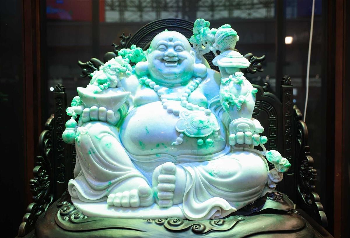 An artwork crafted from a large jadeite block is displayed at the fair. Photo: VNA