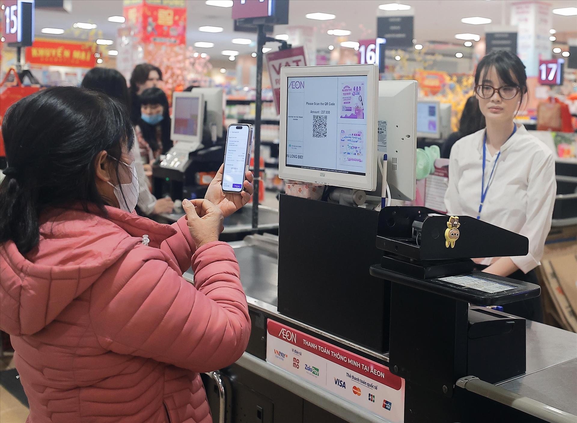 Customers use QR codes for payment at the AEON Long Bien supermarket. Photo: VNA
