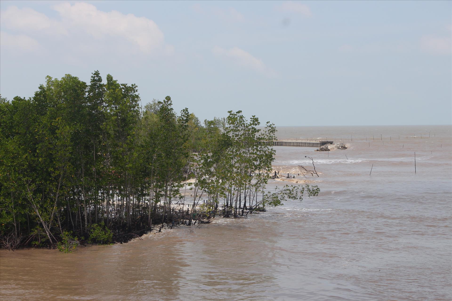 A section of coastal protection forest in Dat Mui Commune (Ca Mau Province) hit by powerful waves. Photo: VNA