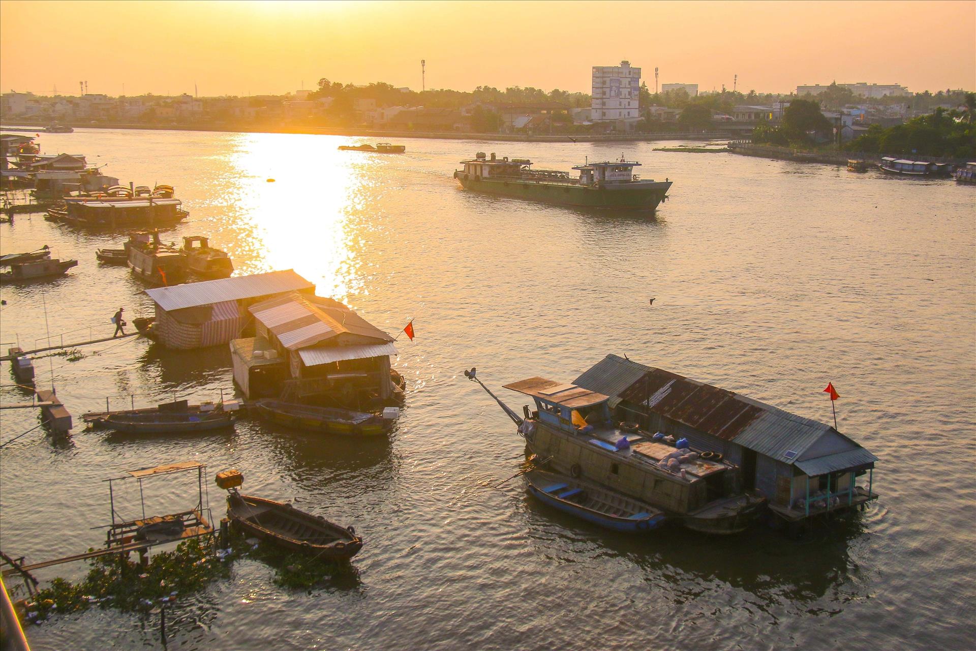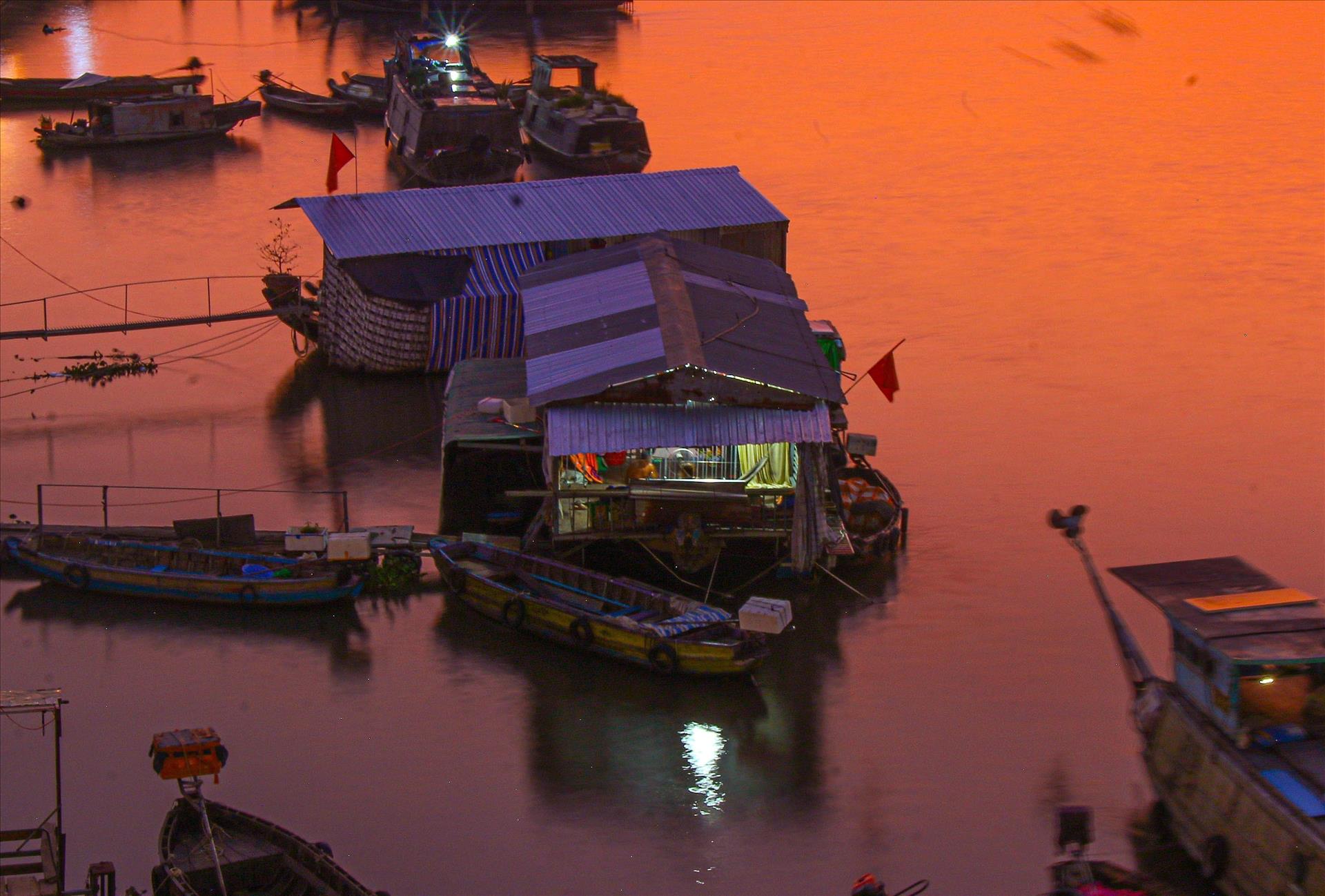 A sparkling Cai Rang floating market in orange sunset. Photo: VNA