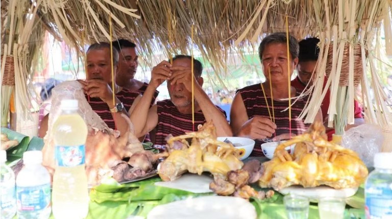 Members of the Cho Ro ethnic community in Bao Vinh Ward perform a ritual reenacting the Sayangva Festival.