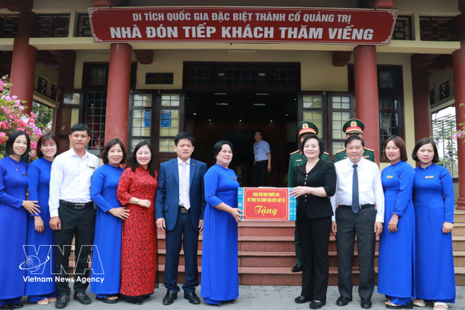 Deputy Prime Minister Pham Thi Thanh Tra presents gifts to staff working at the Quang Tri Ancient Citadel. Photo: VNA