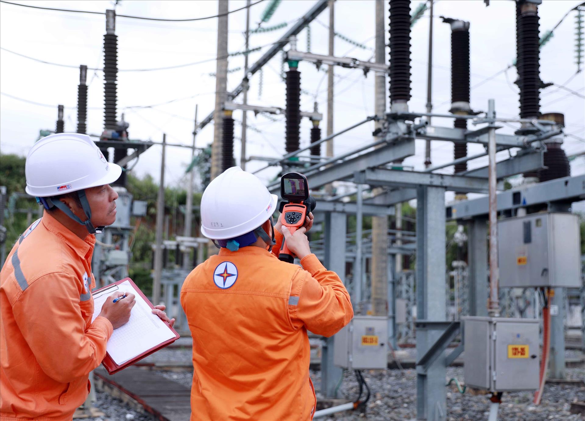Technical staff from Lai Chau Power Company use electronic thermal cameras to inspect contact points on the power grid, aiming to prevent technical failures at the 110kV substation. Photo: VNA