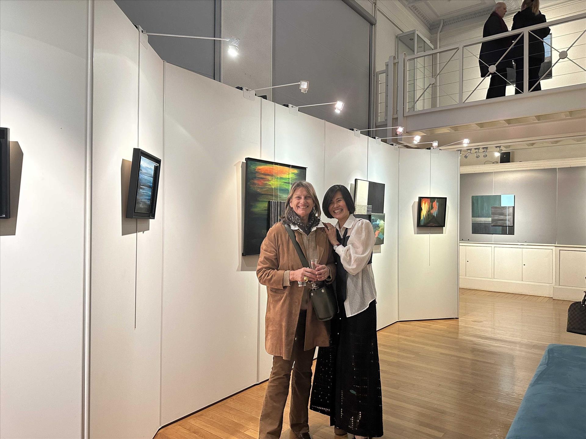 French-Vietnamese painter Lien Pham with a French friend at the exhibition. Photo: VNA