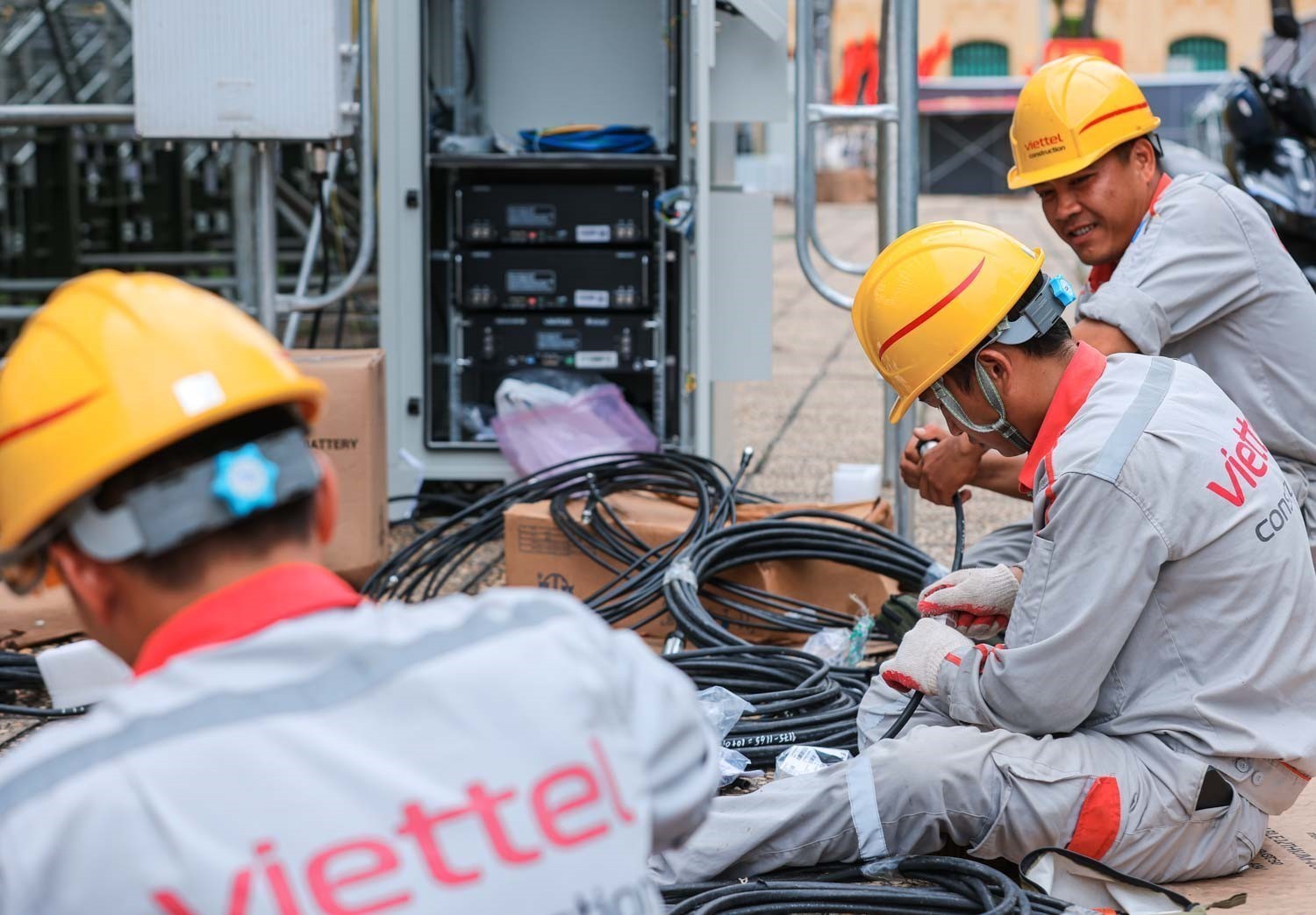 Technicians from Viettel Construction Joint Stock Corporation install and set up 5G base stations. Photo: VNA
