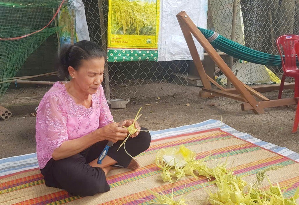 Khmer ethnic women in O Lam commune learn how to weave Ka Tum cake wrappers at the home of artisan Neang Phuong. Photo: VNA