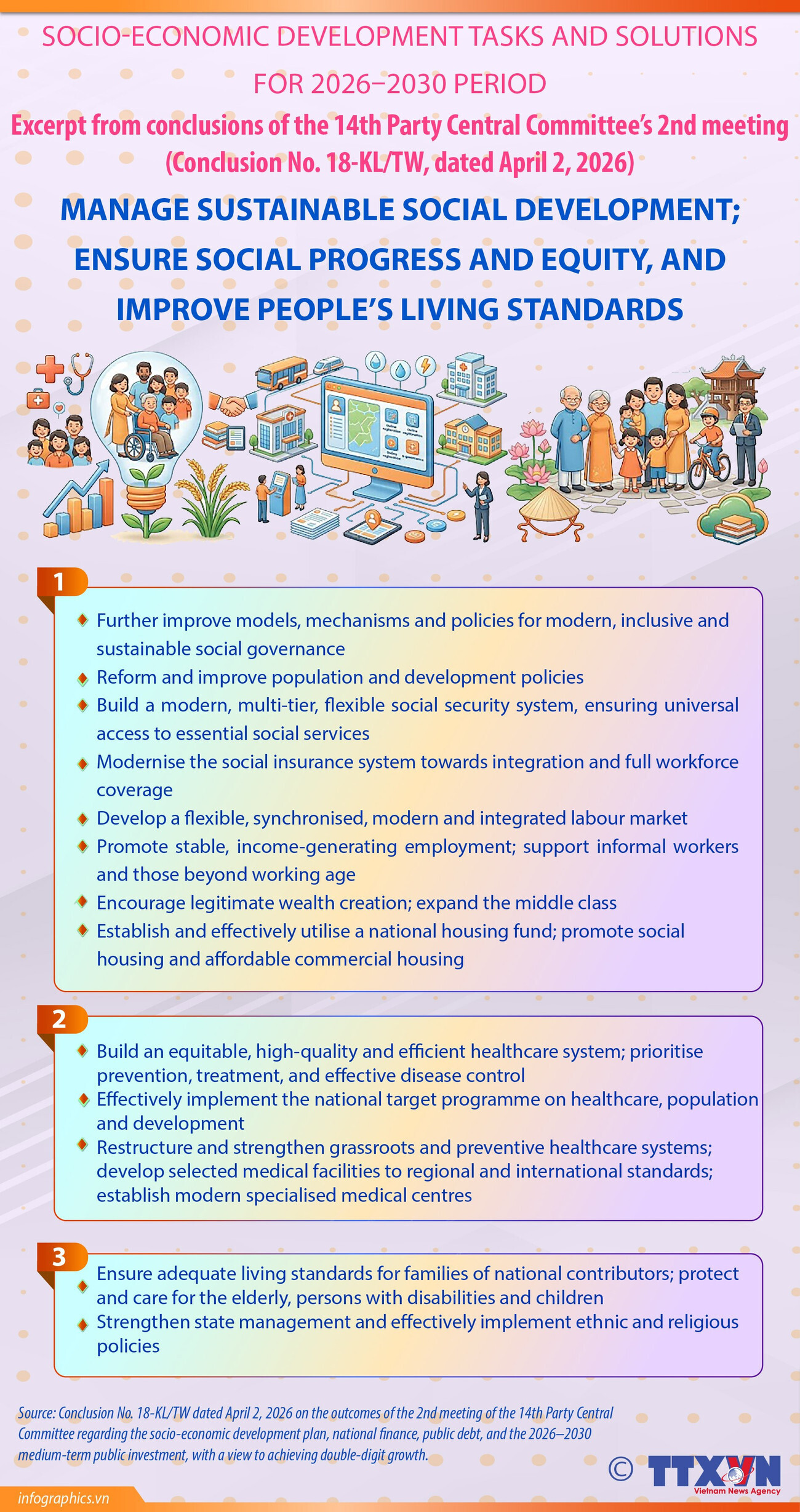 Party General Secretary To Lam has issued Conclusion 18 on the outcomes of the second meeting of the 14th Party Central Committee, outlining key directions for the 2026–2030 socio-economic development plan towards double-digit growth. The Party Central Committee requests the continued resolute and effective implementation of resolutions and conclusions, with a focus on key tasks, especially the management of sustainable social development, ensuring social progress and equity and improving the well-being of the people