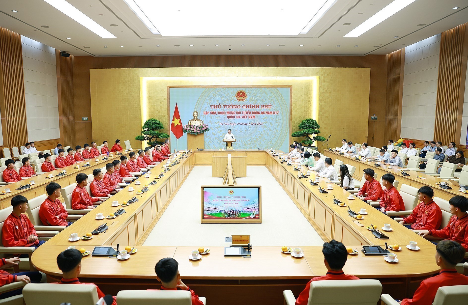 Prime Minister Le Minh Hung meets and congratulates Vietnam’s national U17 men’s football team. Photo: VNA