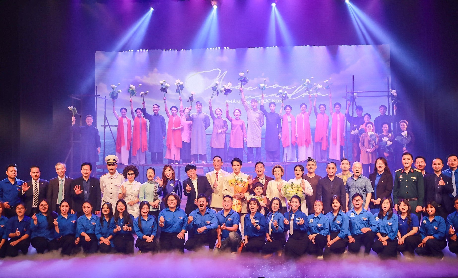 Young representatives pose for a commemorative photo with the cast of the historical Cai Luong opera "No Nuoc Non" (Debt to the Nation). Photo: VNA