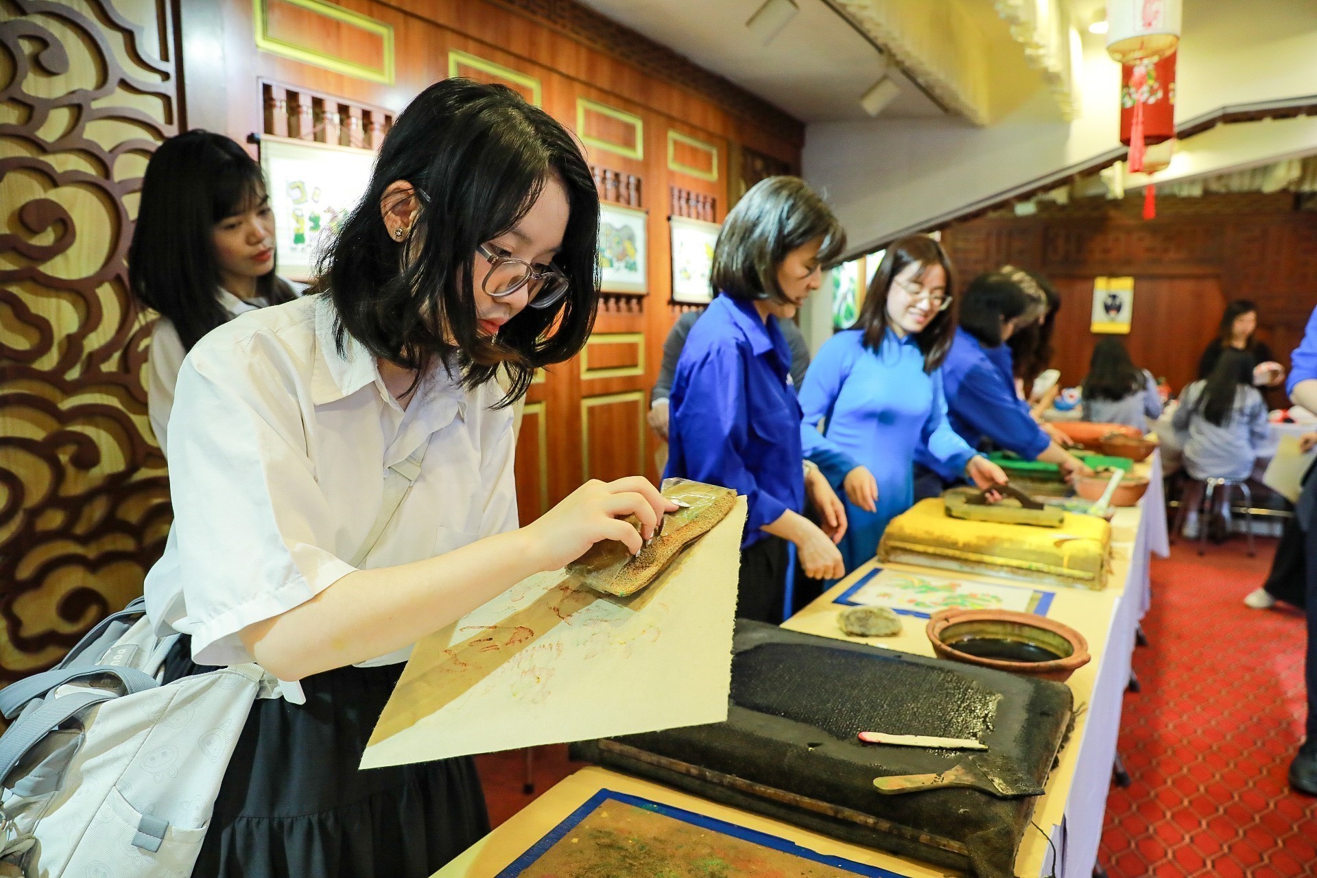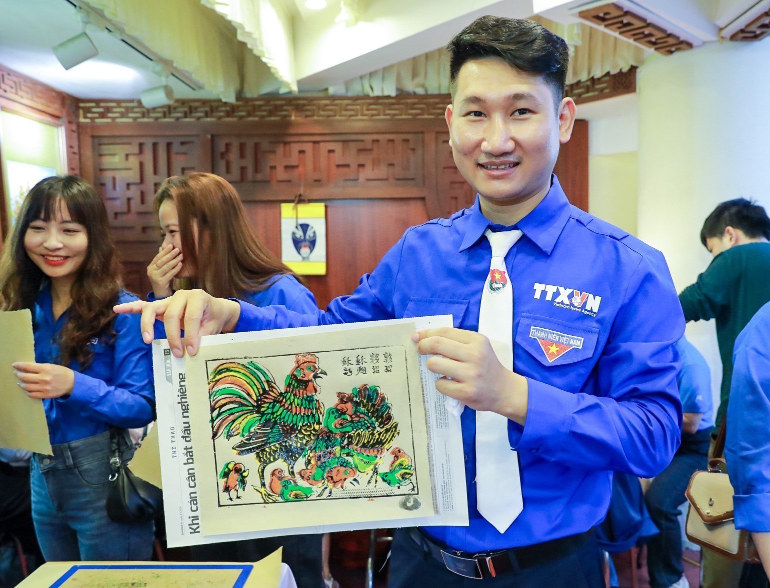 Youth Union members try their hand at the traditional art of Dong Ho folk woodcut printing. Photo: VNA