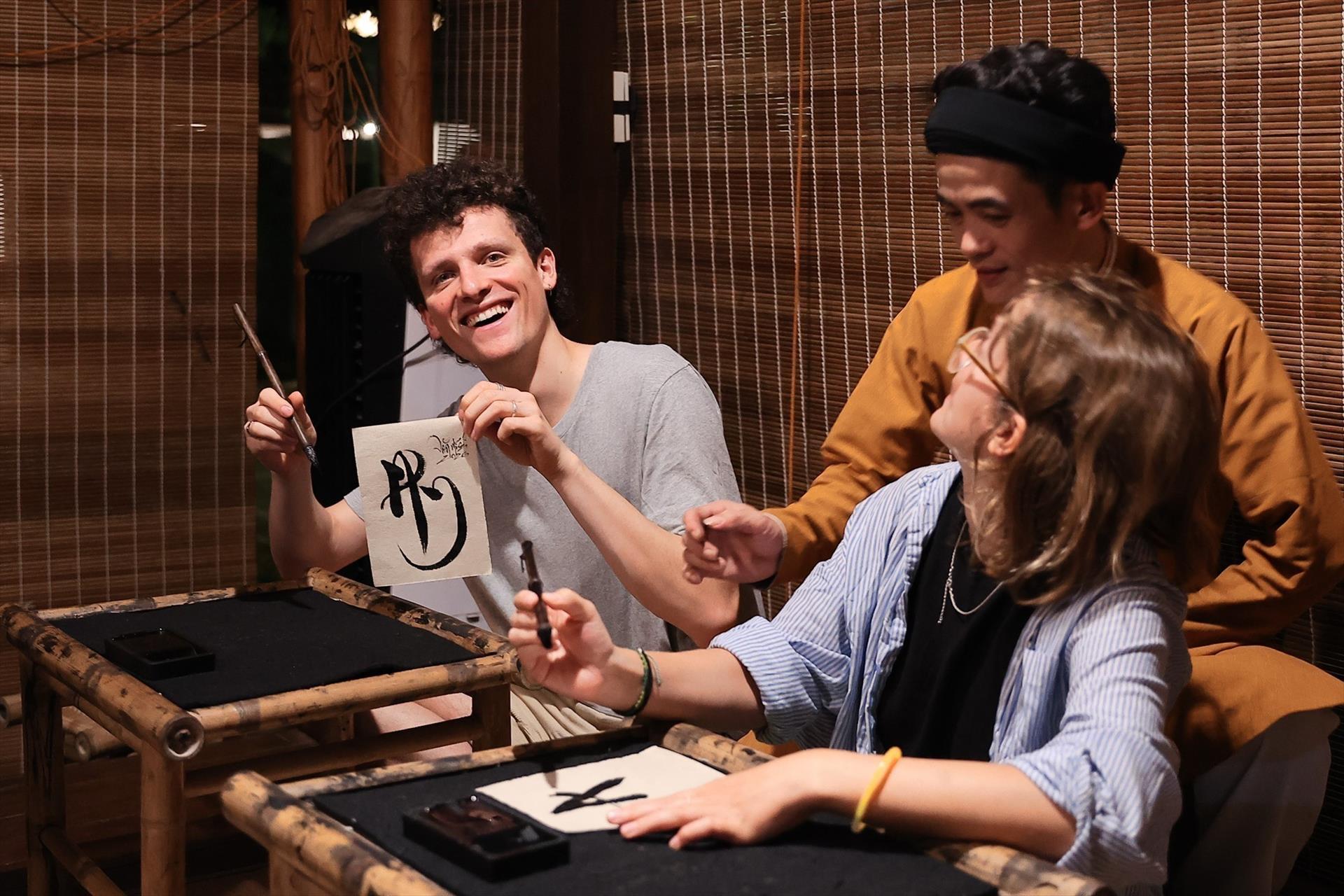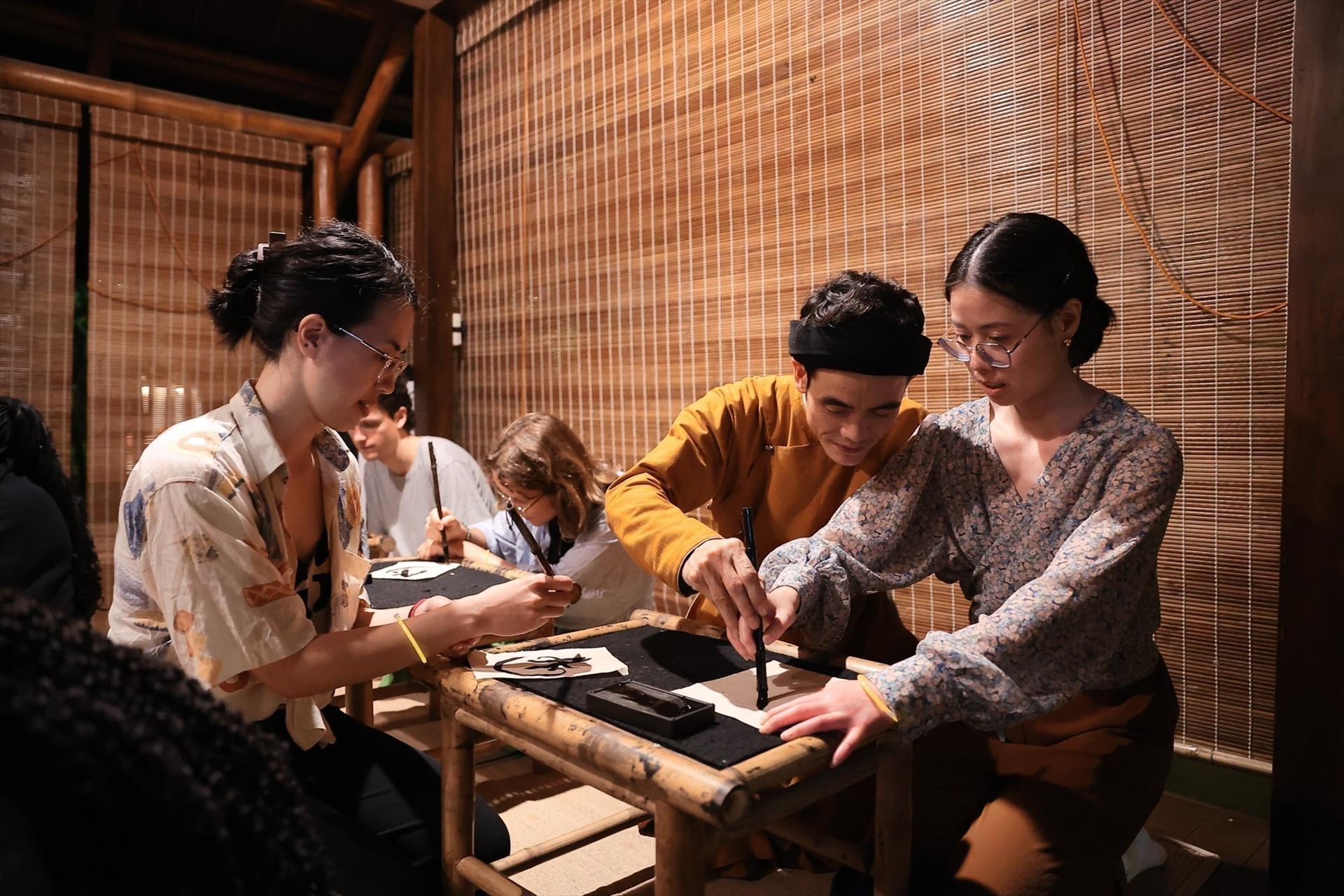 Visitors experience calligraphy at the Temple of Literature, directly holding the brush and practicing each traditional stroke in the ancient cultural space. Photo: VNA