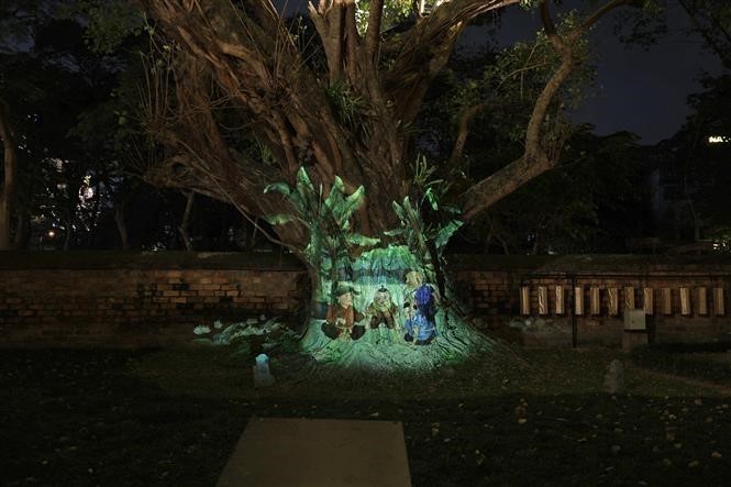 Projection mapping tells old tales on the old tree bark at the Temple of Literature. Photo: VNA