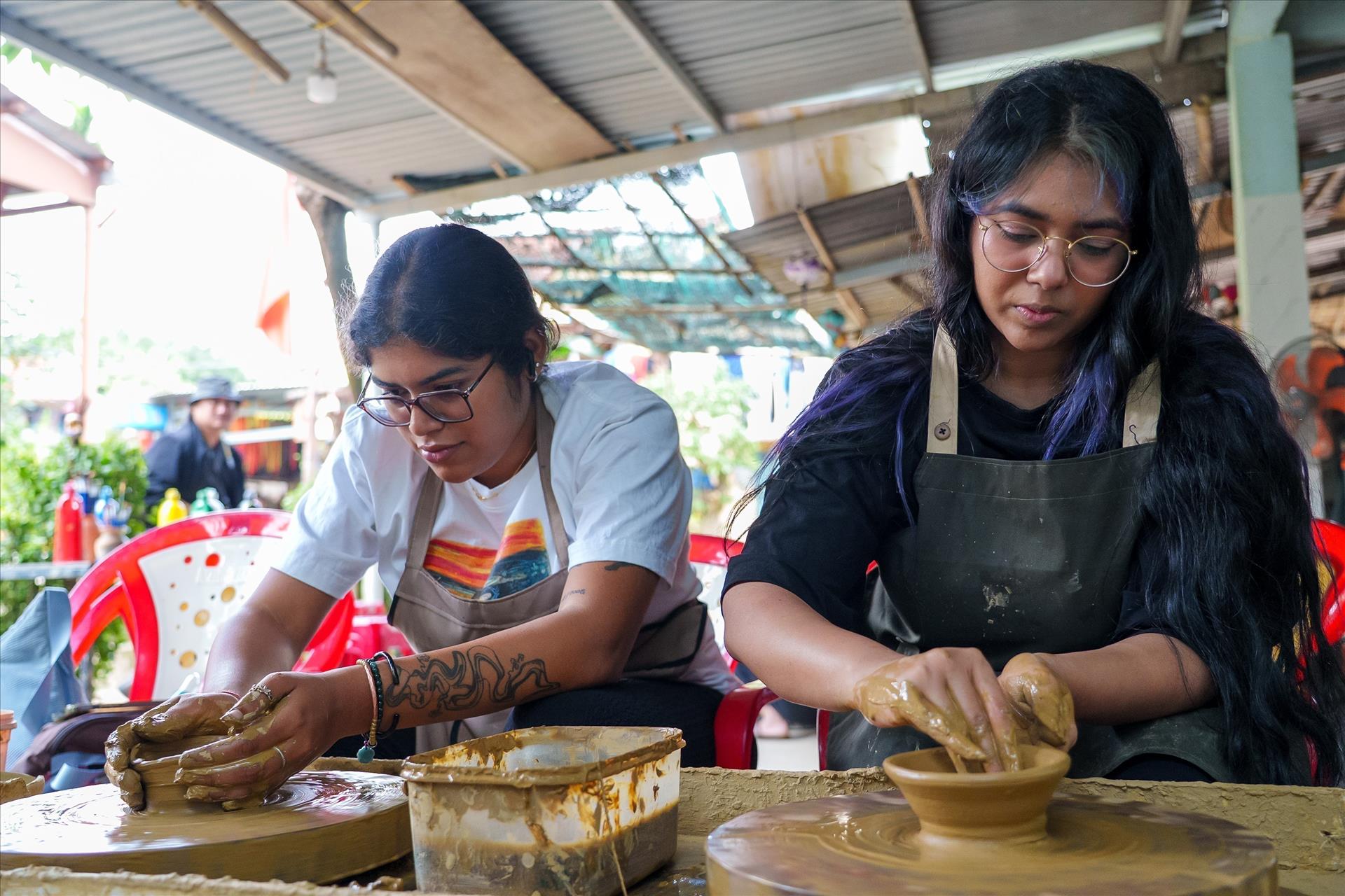 International tourists are eager to try their hand at decorating raw pottery. Photo: VNA