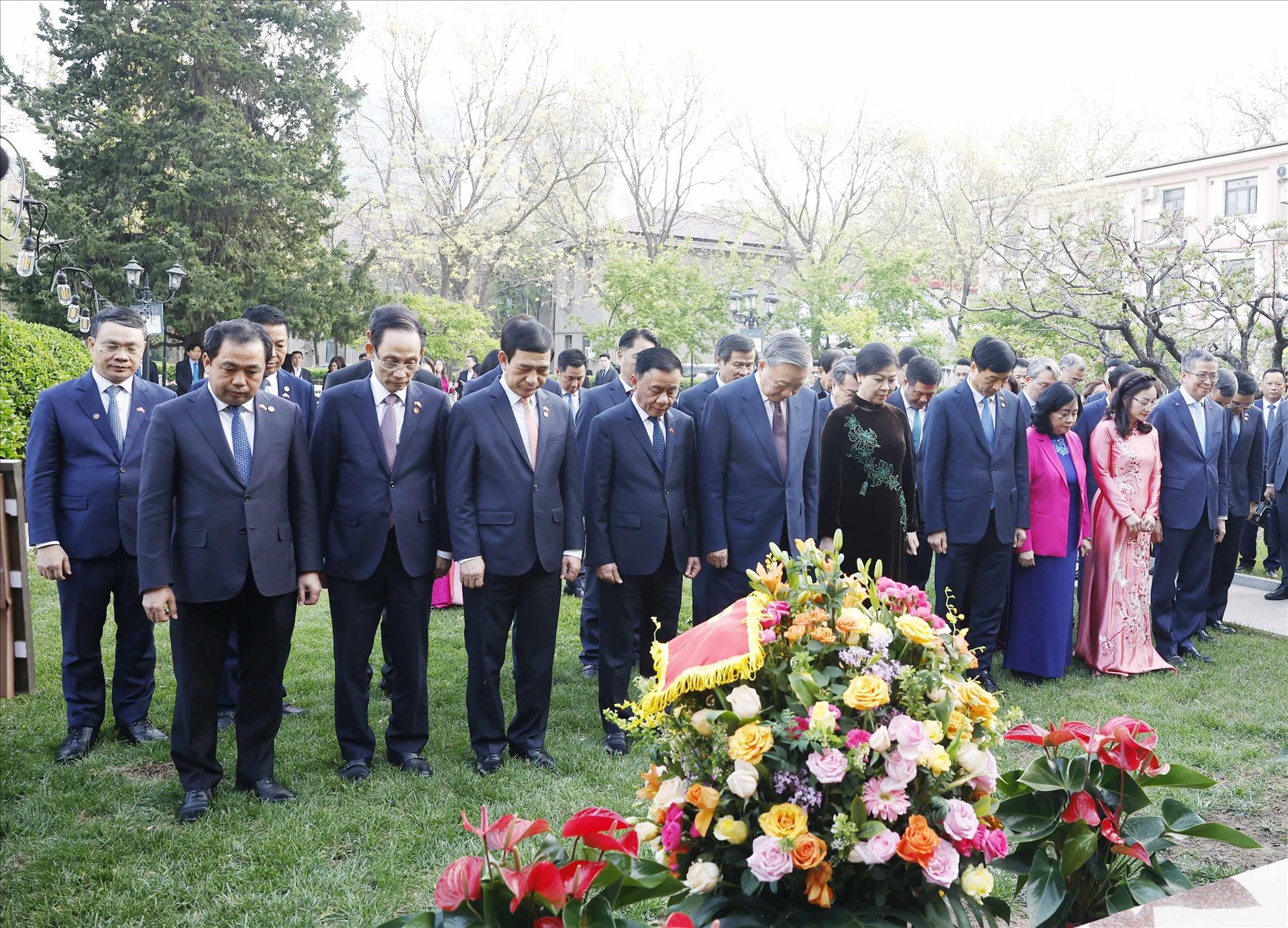 Party General Secretary and State President To Lam, his spouse, and officials offer flowers in tribute to President Ho Chi Minh at the embassy’s premises on April 14. Photo: VNA