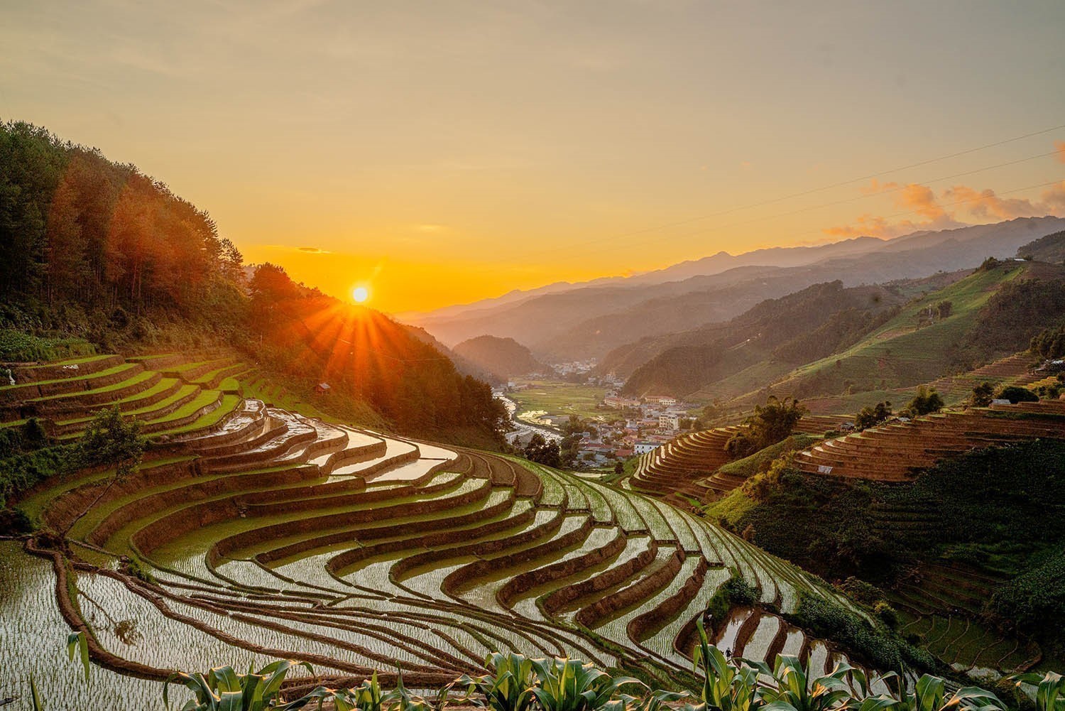 Sun shines over the terraced rice fields during water pouring season, which takes place from May to June each year. Photo: VNA