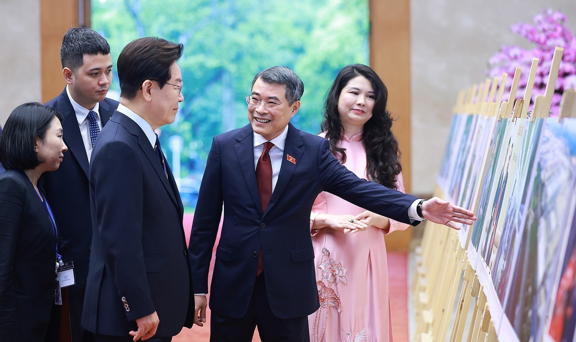 Prime Minister Le Minh Hung and RoK President Lee Jae Myung view a photo exhibition showcasing the relationship between the two countries, organised by the Vietnam News Agency. Photo: VNA
