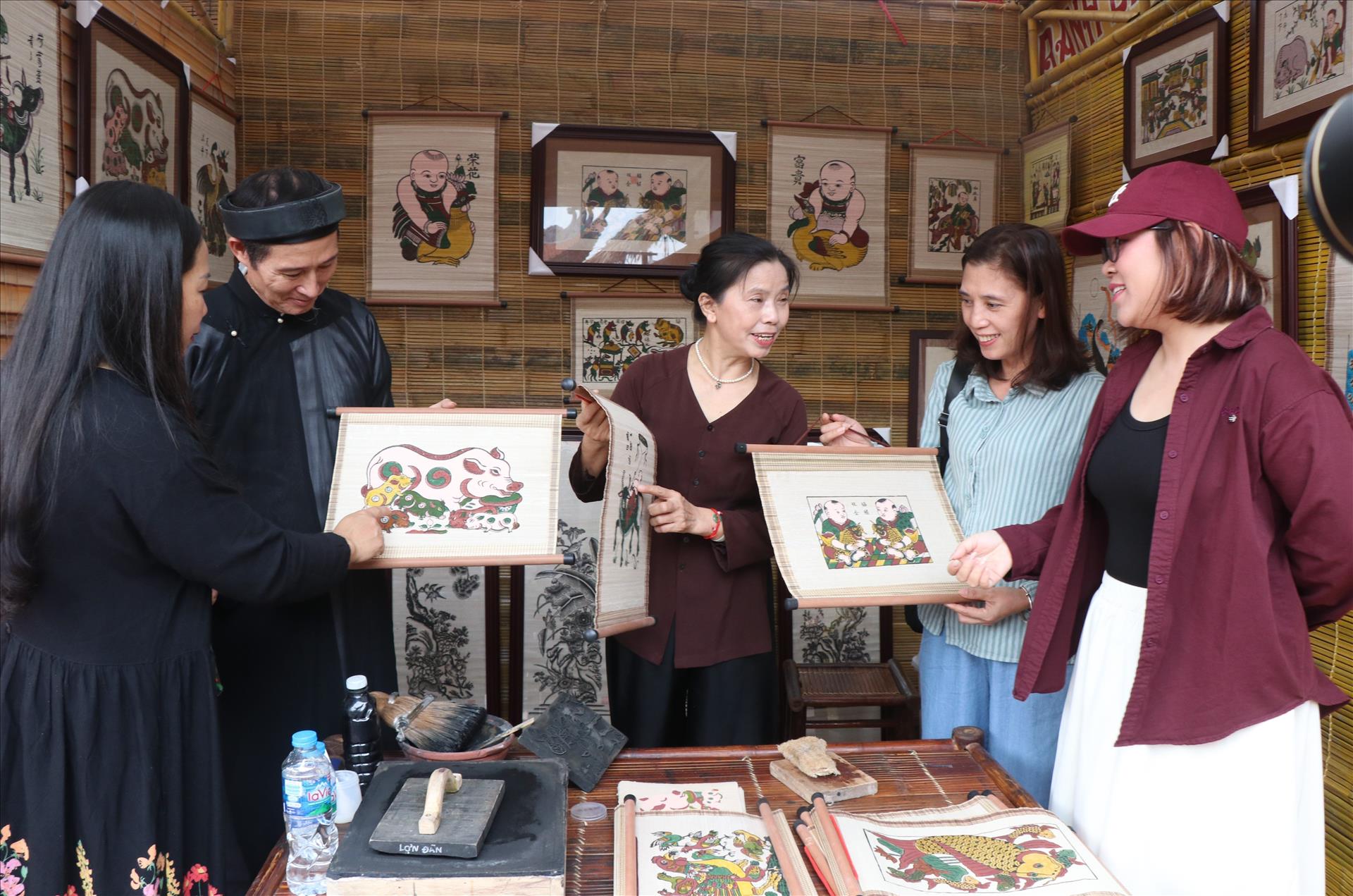 Introducing Dong Ho folk paintings to tourists. Photo: VNA