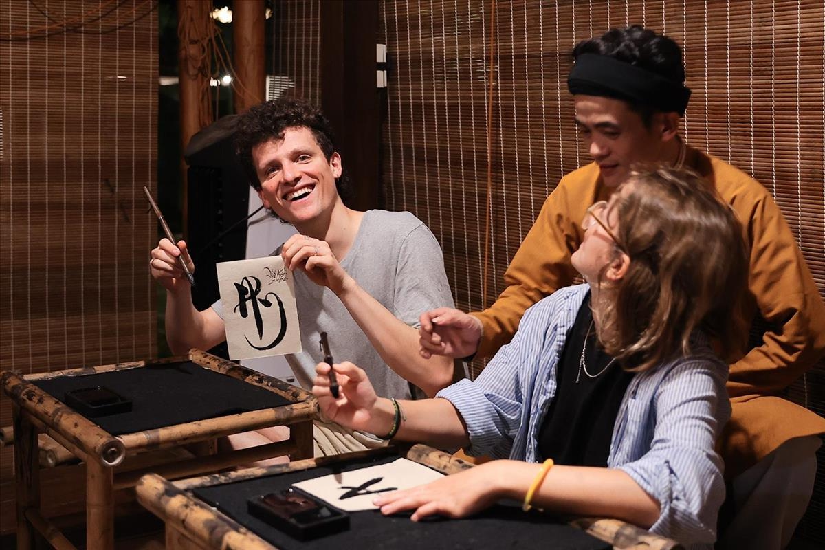 Des touristes étrangers s'initient à la calligraphie lors de leur visite nocturne du Temple de la Littérature. Photo: VNA