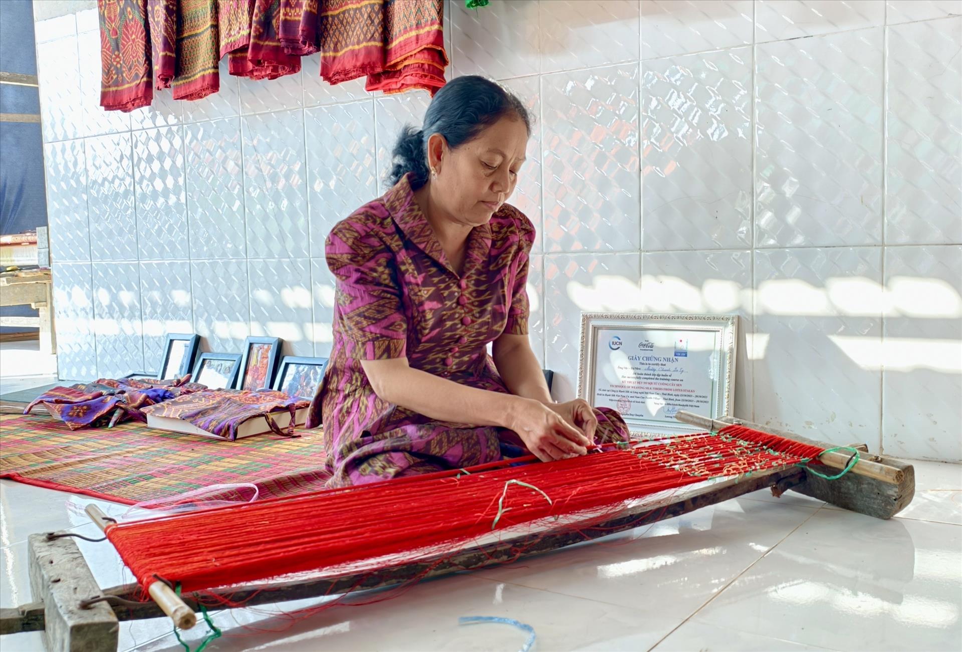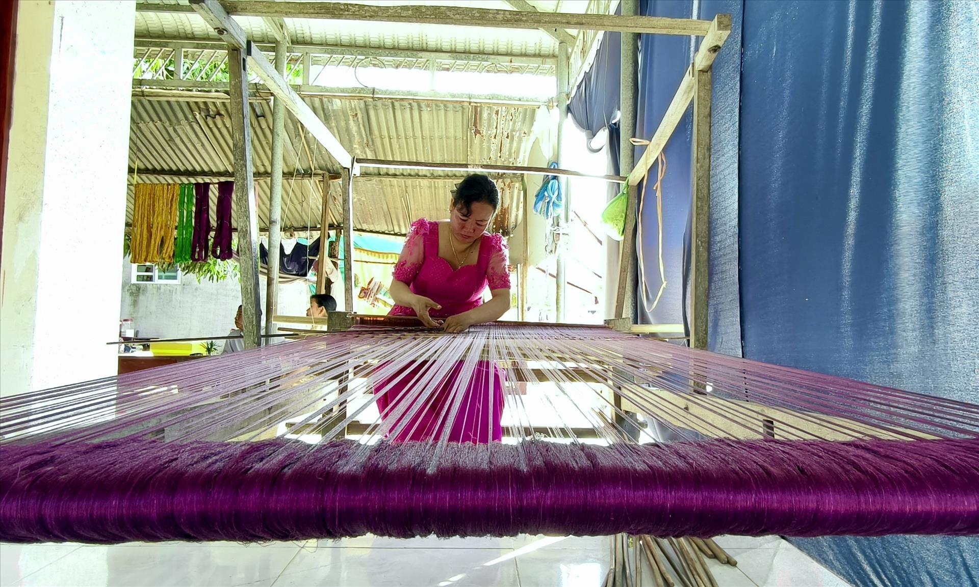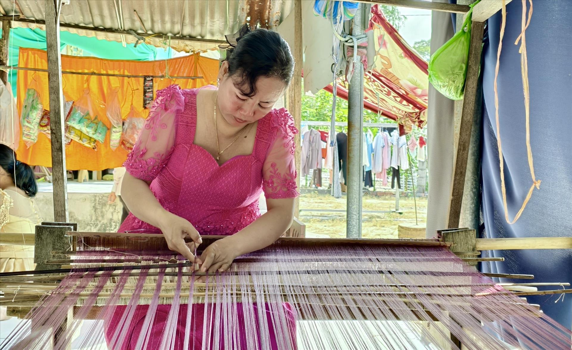 Sur des métiers à tisser artisanaux, les femmes khmères réalisent des étoffes ornées de motifs inspirés de la nature, de la vie quotidienne et des croyances bouddhiques. Photo: VNA