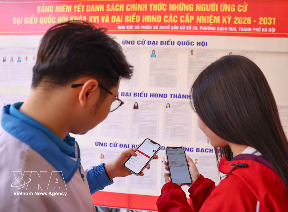 Des électeurs étudiants de l’Université nationale d’économie utilisent la fonctionnalité dédiée aux élections de la 16ᵉ législature de l’Assemblée nationale du Vietnam sur l’application VNeID afin de consulter les informations relatives à leur lieu de vote. Photo: VNA