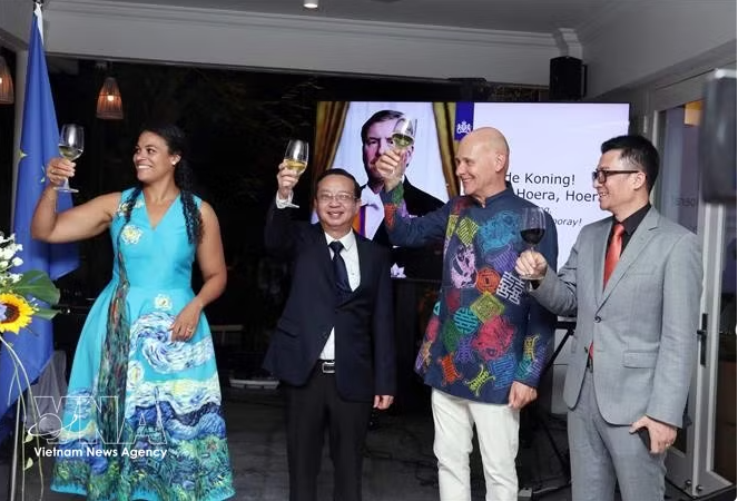 Le vice-président du Comité populaire de Hô Chi Minh-Ville, Bui Minh Thanh (en veste foncée) ; Kees van Baar (deuxième à droite), ambassadeur des Pays-Bas au Vietnam ; et Raissa Marteaux, consule générale des Pays-Bas à Hô Chi Minh-Ville, adressent leurs félicitations au peuple néerlandais à l’occasion de la fête nationale des Pays-Bas. Photo : VNA