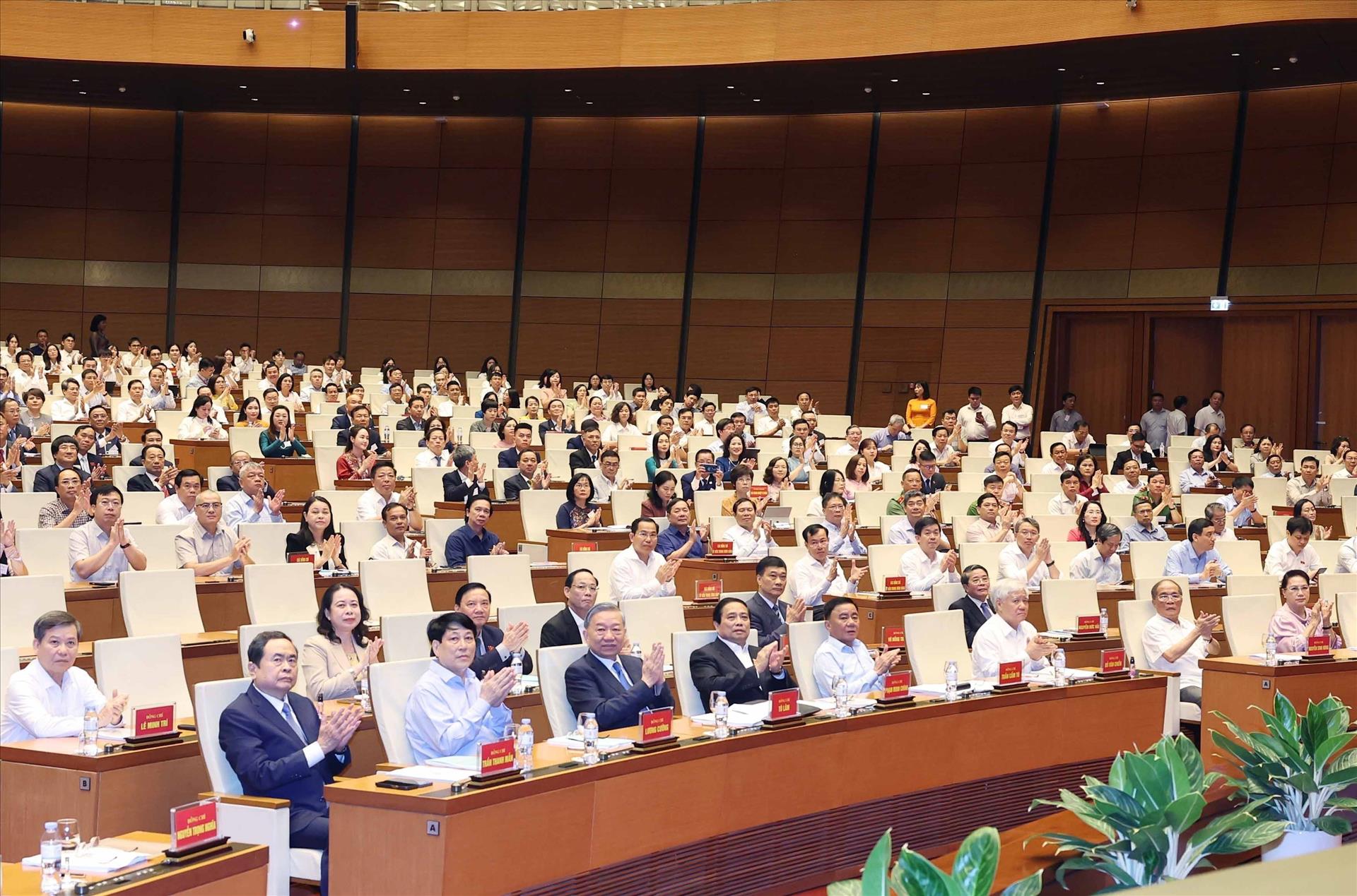Le secrétaire général du PCV Tô Lam, le président Luong Cuong, le Premier ministre Pham Minh Chinh, le président de l'Assemblée nationale Trân Thanh Mân, ainsi que d'autres dirigeants du Parti et de l'État, et des délégués assistent à la conférence. Photo : Thong Nhat – VNA