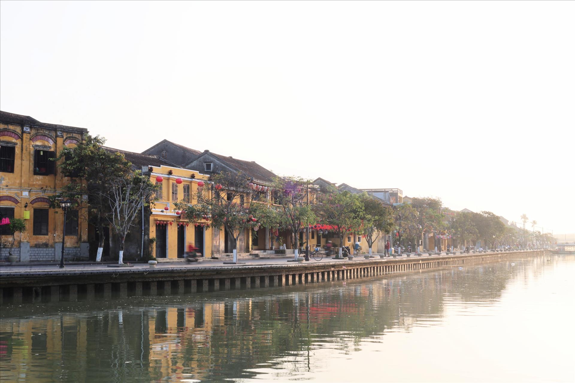 La rangée de maisons anciennes le long de la rivière Hoai se dessine peu à peu sous les rayons du soleil matinal. Photo : VNA