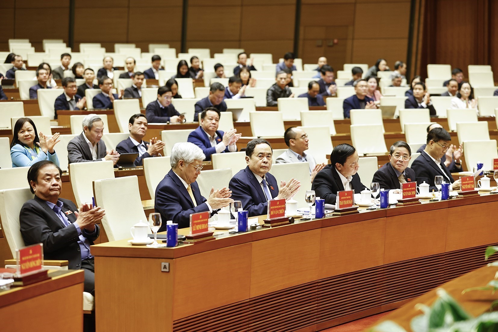 Le président de l'Assemblée nationale Tran Thanh Man (3e, à gauche, première ligne) à la conférence pour annoncer les résultats du 14e Congrès national du Parti communiste du Vietnam. Photo: VNA