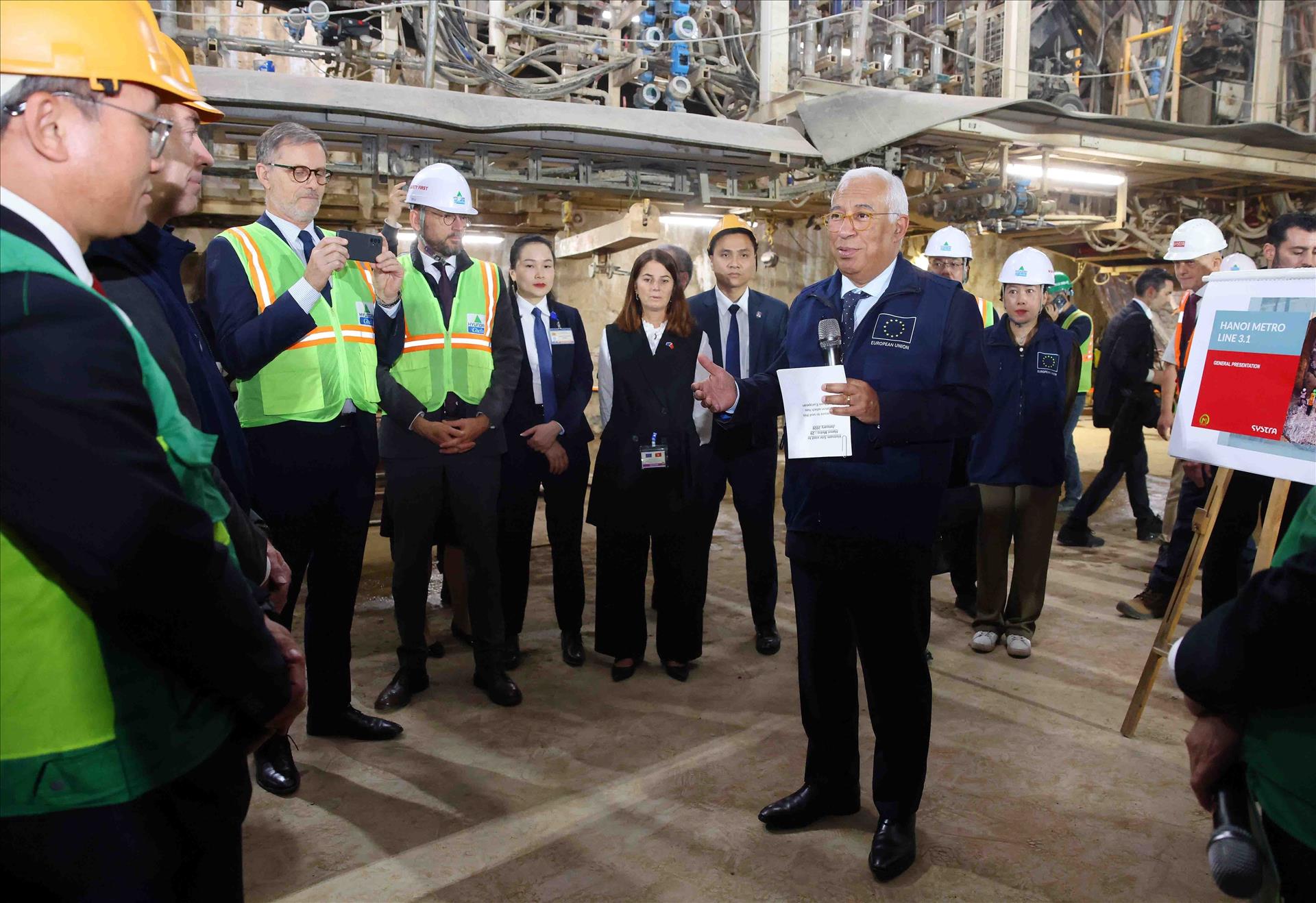 Le président du Conseil européen António Costa visite la section souterraine du projet de la ligne de métro N°3 de Hanoï. Photo: VNA
