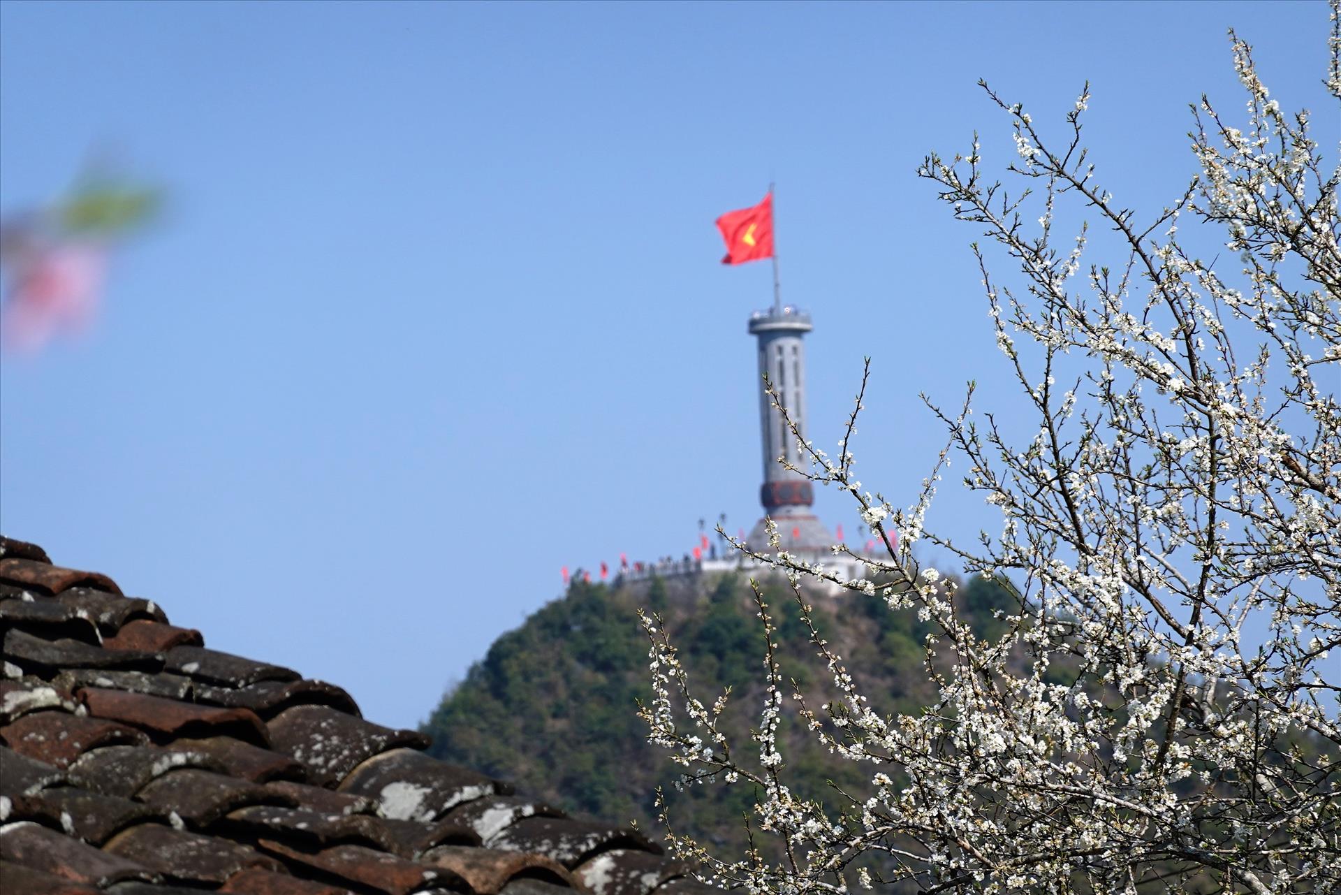 Fleurs de prunier au pied du mât au drapeau de Lung Cu. Photo : Nguyên Thang/VI