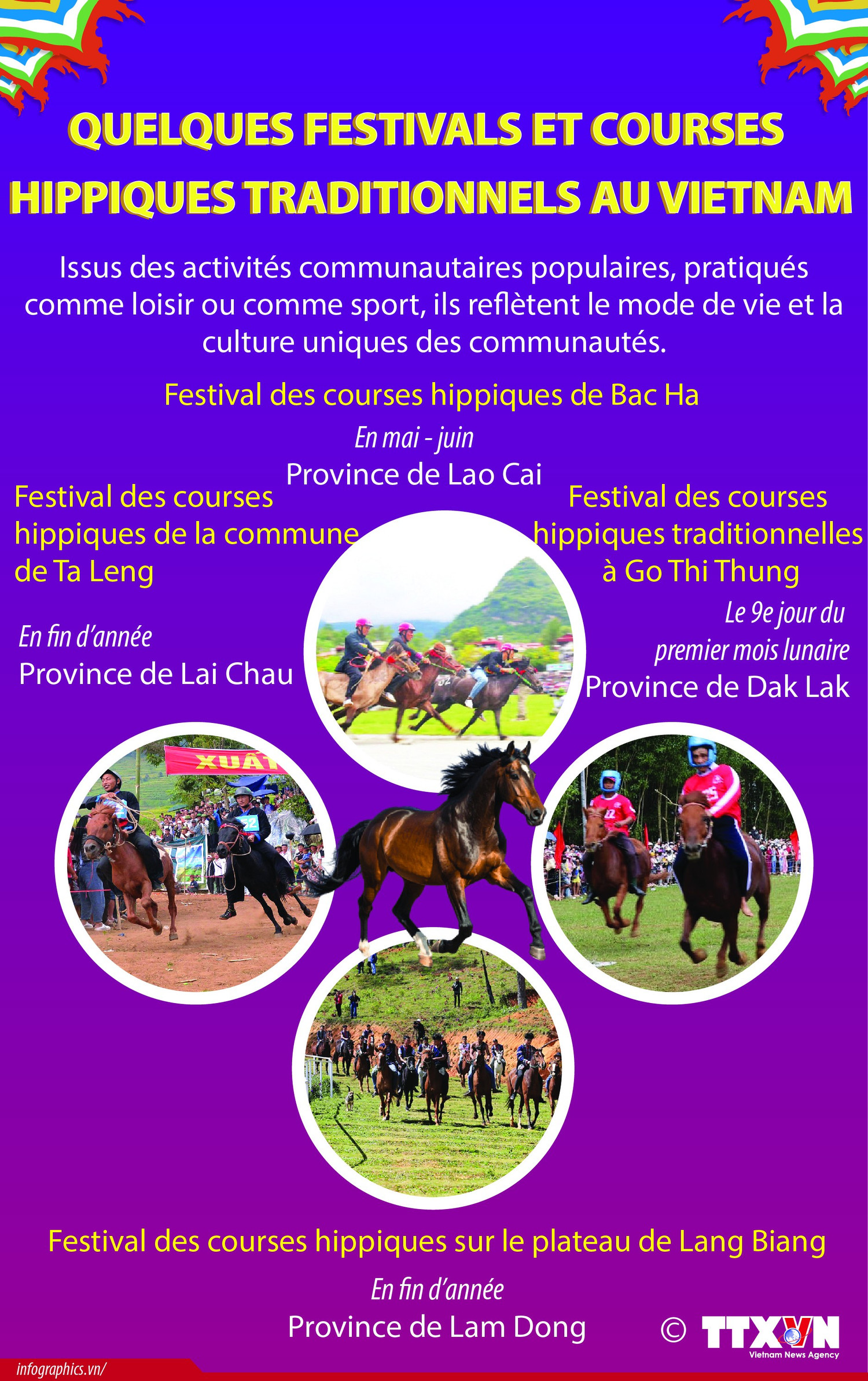 Issus des activités communautaires populaires, pratiqués comme loisir ou comme sport, des festivals et courses hippiques traditionnels au Vietnam reflètent le mode de vie et la culture uniques des communautés.