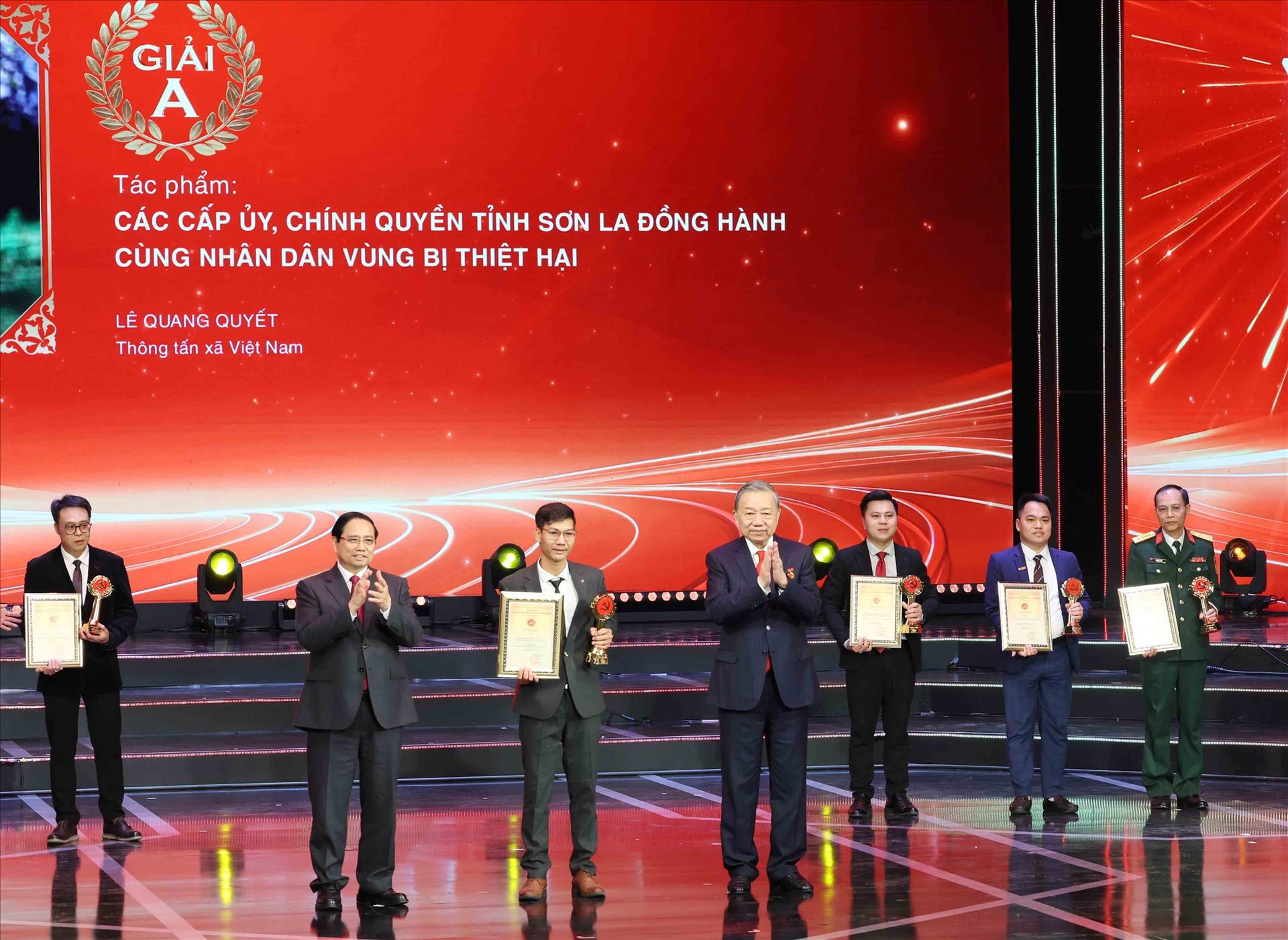 Le secrétaire général du Parti, To Lam, et le Premier ministre Pham Minh Chinh ont personnellement remis les six prix A aux lauréats, dont le groupe d’auteurs Vo Manh Hung – Nguyen Hoai Nam – Doan Minh Anh (journal électronique VietnamPlus, Agence vietnamienne d’Information) pour l’œuvre « Lutte contre le gaspillage foncier – Rationalisation de l’appareil : une “révolution” urgente pour l’essor du pays », ainsi que Le Quang Quyet (Agence vietnamienne d’Information – VNA) pour l’œuvre « Les comités du Parti et les autorités de la province de Son La aux côtés des populations sinistrées ».