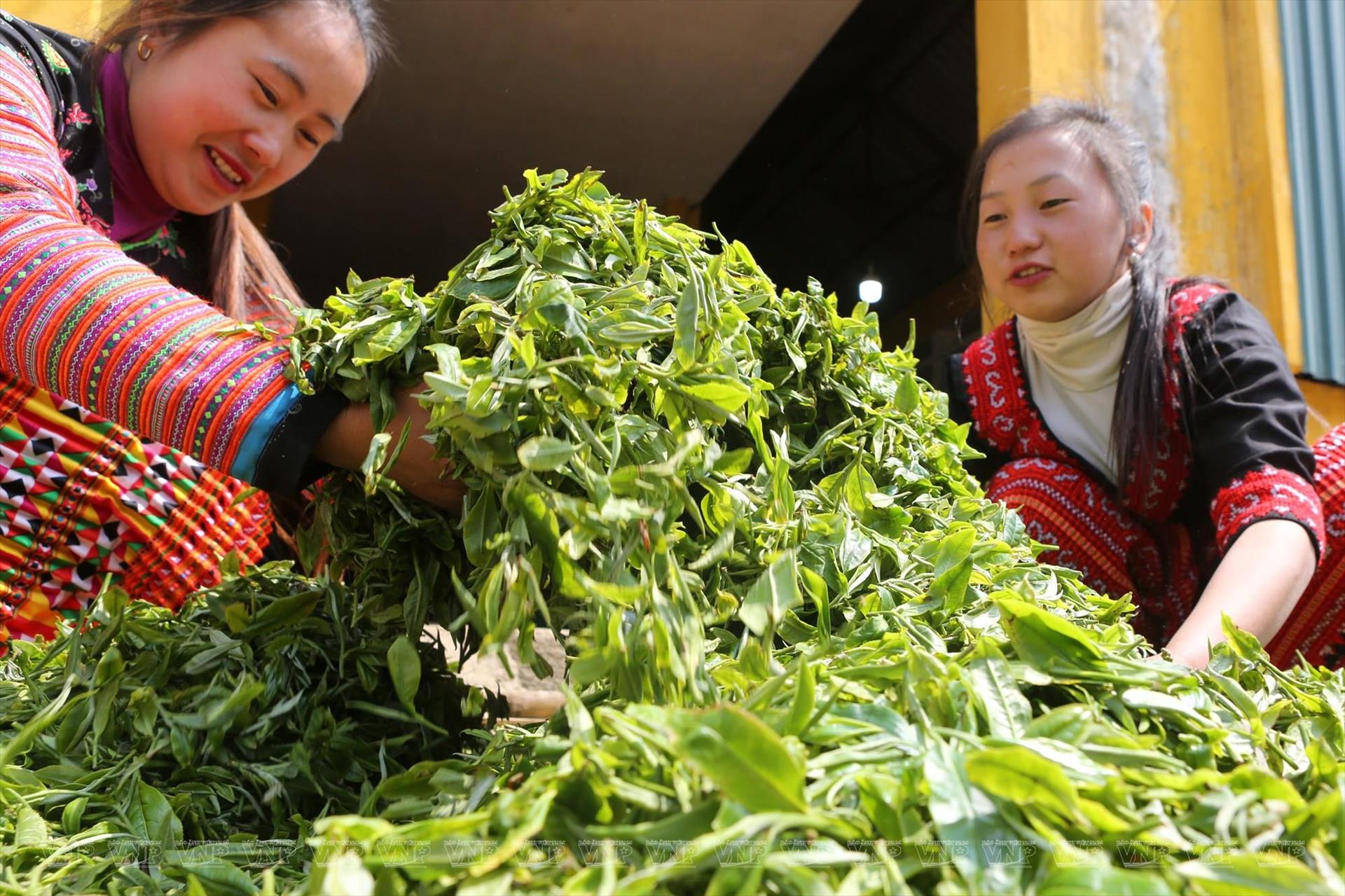 Mùa Thi Tông (à droite) est en train de flétrir des feuilles de thé. Photo: Thông Thiên/VI