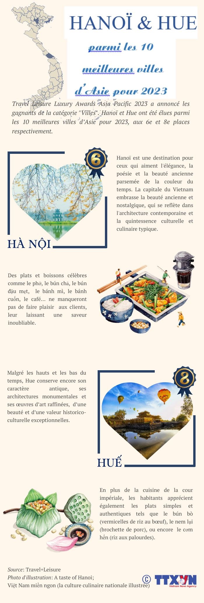 Travel Leisure Luxury Awards Asia Pacific 2023 a annoncé les gagnants de la catégorie "Villes". Hanoï et Hue ont été élues parmi les 10 meilleures villes d’Asie pour 2023, aux 6e et 8e places.