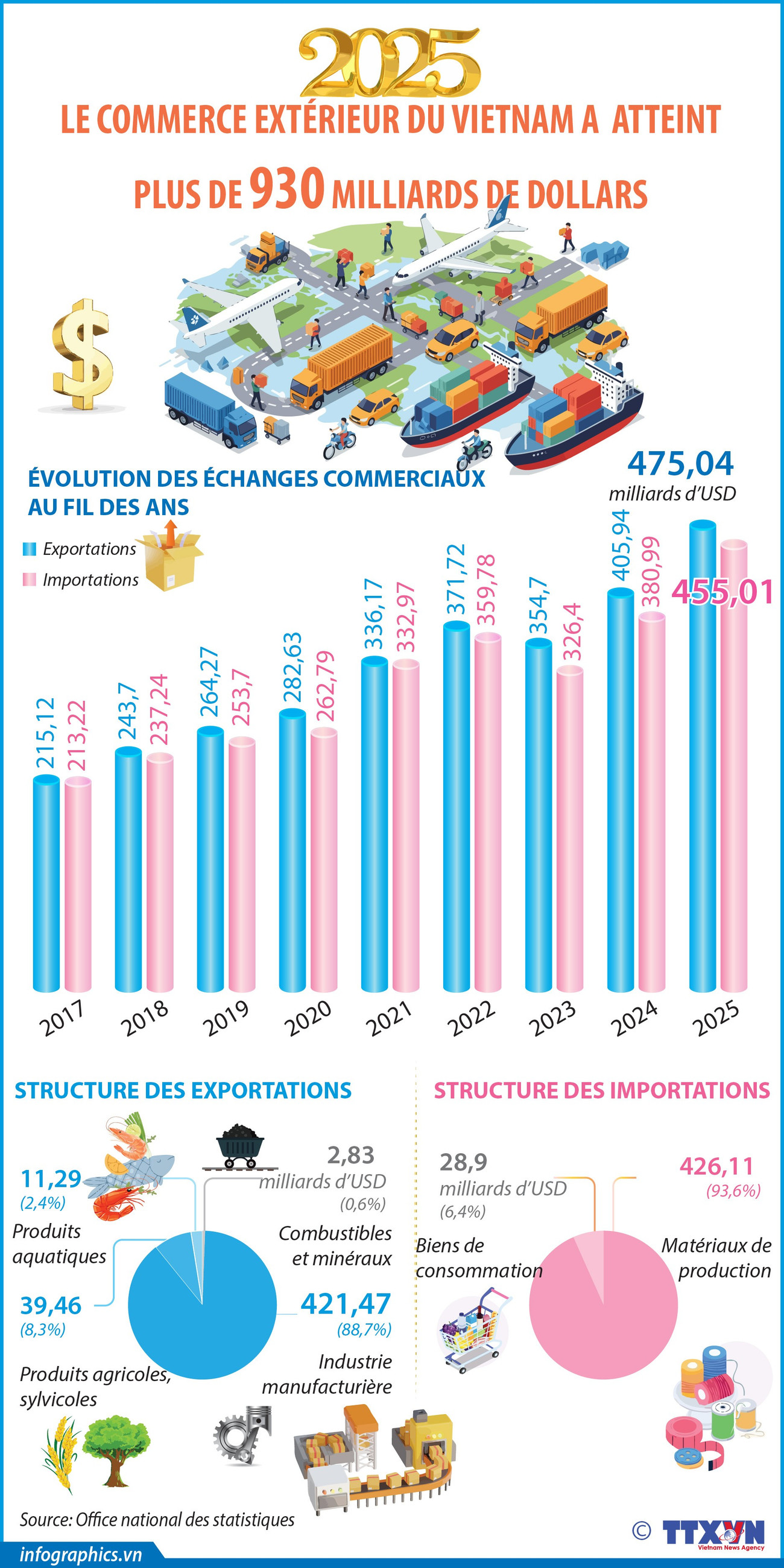 Le volume total des échanges commerciaux du Vietnam a atteint 930,05 milliards de dollars en 2025, affichant une progression robuste de 18,2% par rapport à l'année précédente, portée par une croissance de 17% des exportations et de 19,4% des importations.