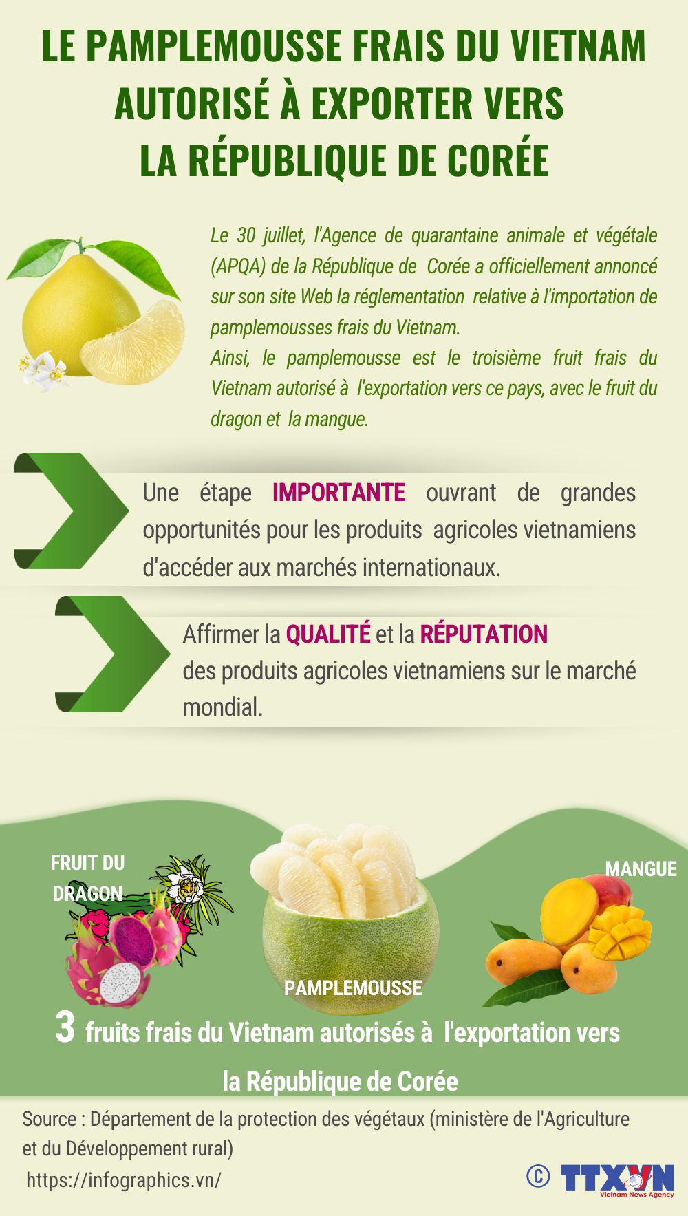 Le 30 juillet, l'Agence de quarantaine animale et végétale de la République de Corée a officiellement annoncé sur son site Web la réglementation relative à l'importation de pamplemousses frais du Vietnam. Ainsi, le pamplemousse est le troisième fruit frais du Vietnam autorisé à l'exportation vers ce pays.