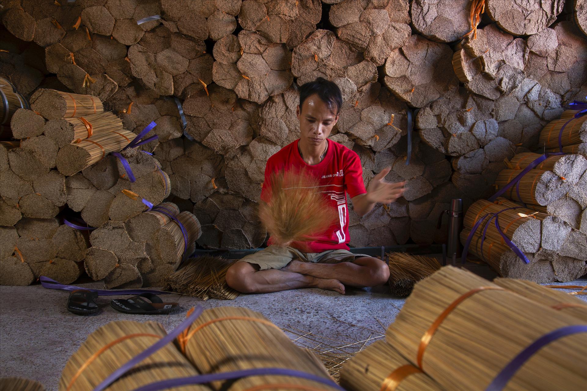 クアンフーカウ村の線香作りは、何世代にもわたり人々の生活に深く根付いてきました。以前は、竹の軸を削ることから、根本の染色、線香の巻き上げ、乾燥まで、すべての工程が手作業で行われ、多くの時間と労力を要しました。現在では機械が導入され、生産性が向上し、職人の負担もある程度軽減されています。時代の変化を経ても、この線香作りは今もなお、この地域の人々にとって重要な生計手段となっています。村の行政代表者によれば、現在では村の世帯の約70%が線香の生産に従事しており、数千人の労働者に安定した雇用と収入をもたらしています。