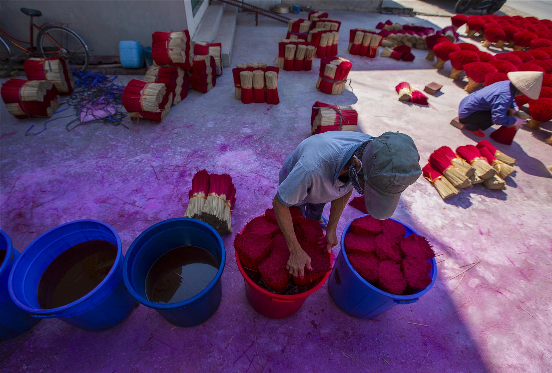 長年、線香作りに携わってきた職人のフンさんは、昔は線香をただ畑に干すだけだったが、今では鮮やかな色彩が職人自身に新しい喜びをもたらしていると、嬉しそうに語っていました。訪れる観光客はますます増え、線香を買って、sns映えする写真を撮るだけでなく、生産工程を学び、いくつかの作業を直接体験する人も増えています。こうした工芸村の見学スポットが生まれてきたことは、まさにクアンフーカウの人々が現代の生活を通して伝統工芸の真髄を伝える手段でもあります。