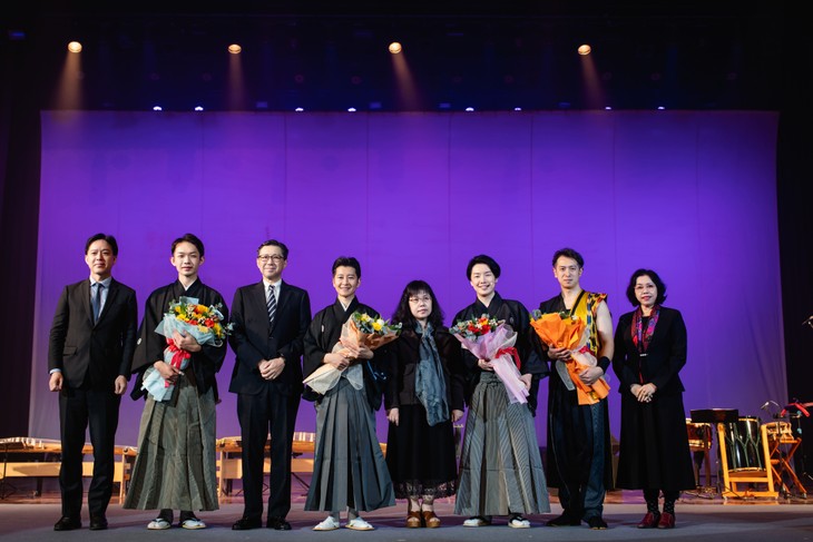 吉岡憲彦所長と在ダナン日本総領事館の森健朗総領事らが、フエで日本の音楽界の最前線で活躍する4人の演奏家による新ユニット「AKATSUKI」のアーティストに花束を贈呈(写真:JPF)
