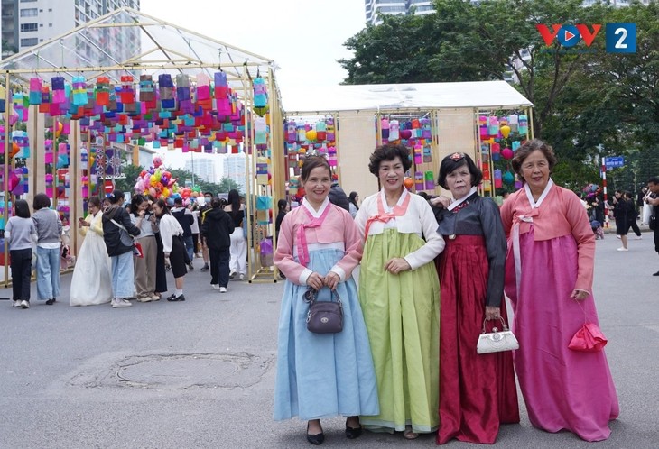「韓国文化ロード・フェスティバル2025」で韓国の伝統衣装を試着する来場者(写真:CTV Trần Quỳnh Diễm My/VOV2)