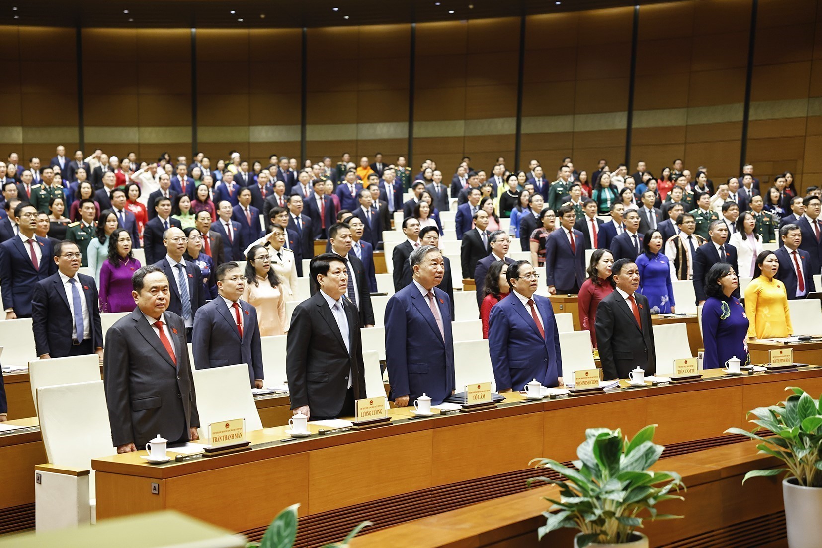 第16期国会第1回会期が、6日午前、ハノイの国会議事堂で厳かに開会しました。開会式には、トー・ラム党書記長、ルオン・クオン国家主席、ファム・ミン・チン首相、チャン・タイン・マン国会議長、チャン・カム・トゥ書記局常務をはじめ、外交団や国際機関の代表、第16期国会議員およそ500人が出席しました。