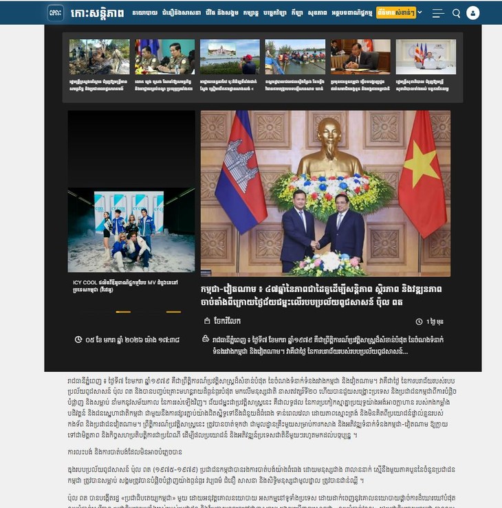 ក្នុងឱកាសរំលឹកខួបលើកទី ៤៧ នៃជ័យជម្នះលើរបបប្រល័យពូជសាសន៍ (ថ្ងៃទី ៧ ខែមករា ឆ្នាំ ១៩៧៩ – ថ្ងៃទី ៧ ខែមករា ឆ្នាំ ២០២៦) ប្រព័ន្ធផ្សព្វផ្សាយនៅកម្ពុជាបានបង្ហោះអត្ថបទជាច្រើន ដែលបញ្ជាក់ពីអត្ថន័យប្រវត្តិសាស្ត្រនៃថ្ងៃទី ៧ ខែមករា និងសម្ដែងនូវការដឹងគុណយ៉ាងជ្រាលជ្រៅចំពោះការជួយឧបត្ថម្ភពីកងទ័ពស្ម័គ្រចិត្តវៀតណាម។ យោងតាមកាសែត Fresh News និង Sidynews ជ័យជម្នះថ្ងៃទី ៧ ខែមករា ឆ្នាំ ១៩៧៩ គឺជាព្រឹត្តិការណ៍ដ៏សំខាន់ក្នុងប្រវត្តិសាស្ត្រ។ ដោយឆ្លើយតបទៅនឹងការអំពាវនាវជាបន្ទាន់របស់រណសិរ្សសាមគ្គីសង្គ្រោះជាតិកម្ពុជា និងអនុវត្តន៍សិទ្ធិការពារខ្លួនដ៏ស្របច្បាប់នោះ ប្រទេសវៀតណាមបានចាត់ទុកអាយុជីវិតនិងសន្តិភាពរបស់ប្រជាជនកម្ពុជាជាចម្បងបំផុត ដោយបានបញ្ជូនកម្មាភិបាល និងកងទ័ពស្ម័គ្រចិត្តរាប់ម៉ឺននាក់ទៅជួយ សង្គ្រោះប្រជាជនកម្ពុជា ឲ្យរួចផុតពីមាត់ជ្រោះនៃគ្រោះប្រល័យពូជសាសន៍ហើយសម្រេចបានជ័យជម្នះនាថ្ងៃទី ៧ ខែមករា ឆ្នាំ ១៩៧៩។រូបថតអេក្រង់ពីកាសែតកោះសន្តិភាព។ទំព័រមុខនៃកាសែត កោះសន្តិភាព បានធ្វើអត្ថាធិប្បាយថា ទំនាក់ទំនងរវាងវៀតណាម និងកម្ពុជាក្នុងរយៈពេល ៤៧ ឆ្នាំកន្លងមកនេះ គឺជាដំណើរនៃ ភាពជាដៃគូនិងការអភិវឌ្ឍ។ អត្ថបទដែលបានបង្ហោះលើកាសែត Fresh News និង CAM POST ក៏បានសង្កត់ធ្ងន់លើស្ថានភាពបច្ចុប្បន្ននិងអនាគត ខណៈដែលទំនាក់ទំនងវៀតណាម-កម្ពុជាបានផ្លាស់ប្តូរយ៉ាងខ្លាំងពីការគាំទ្រផ្នែកយោធាទៅជាកិច្ចសហប្រតិបត្តិការសេដ្ឋកិច្ច នយោបាយ និងវប្បធម៌។ កាសែតធំៗរបស់កម្ពុជាបានឯកភាពគ្នាថា ប្រសិនបើគ្មានជ័យជម្នះថ្ងៃទី ៧ ខែមករា និងការជួយឧបត្ថម្ភពីវៀតណាម ក៏ដូចជាប្រទេសជាមិត្តដទៃទៀតទេ កម្ពុជាមិនអាចសម្រេចបាននូវឋានៈនិងការអភិវឌ្ឍដូចសព្វថ្ងៃនេះឡើយ៕